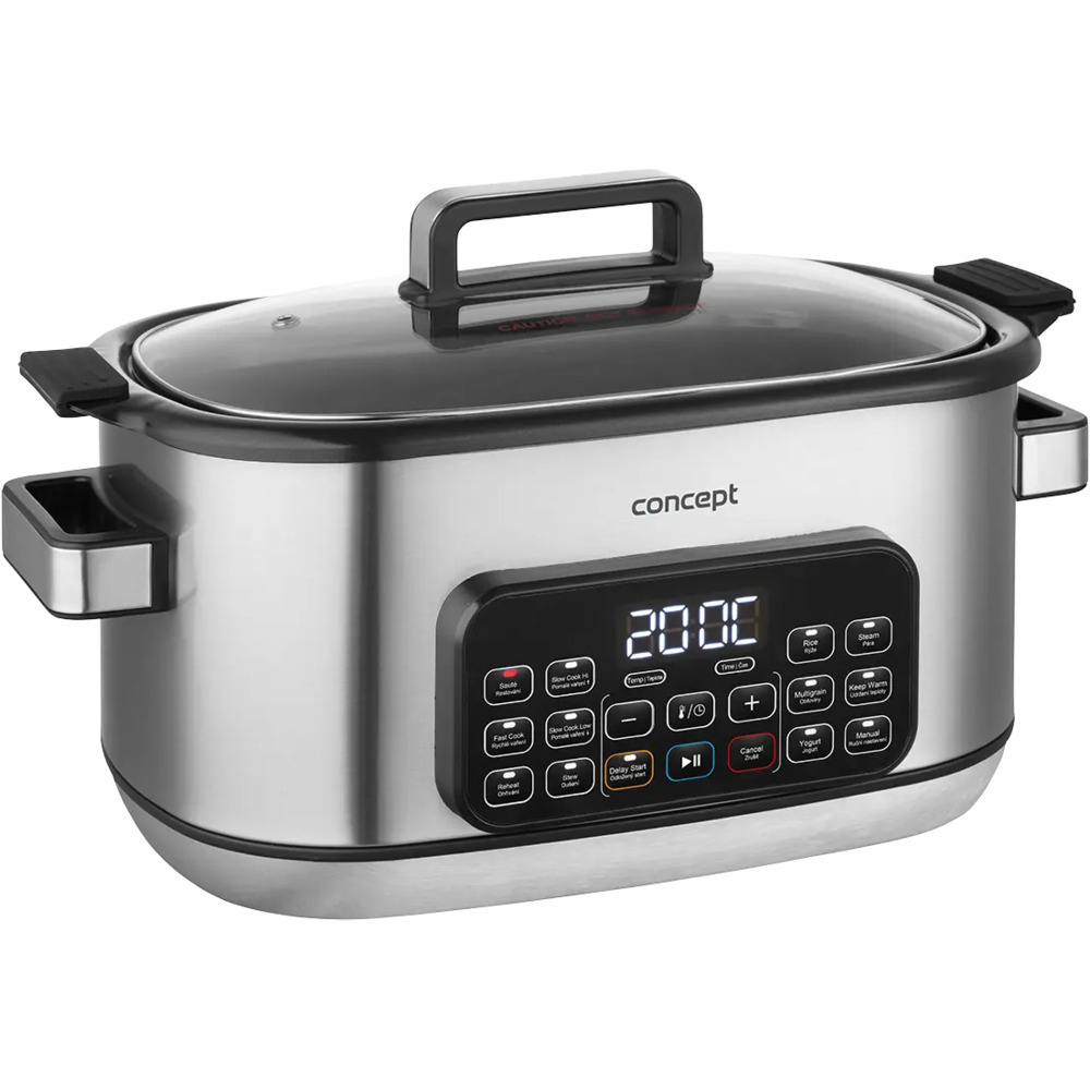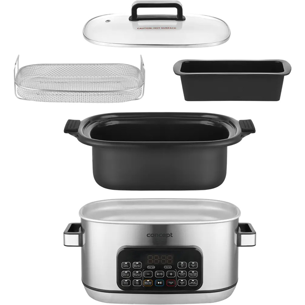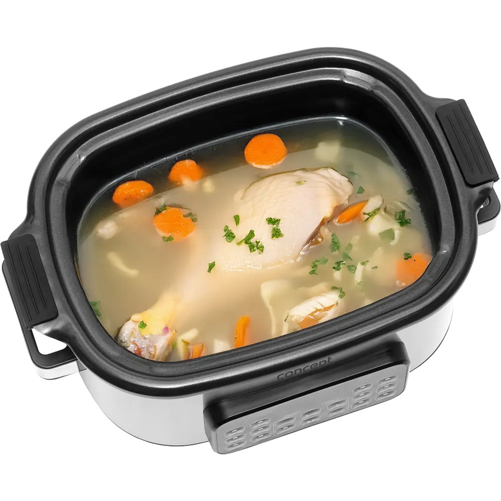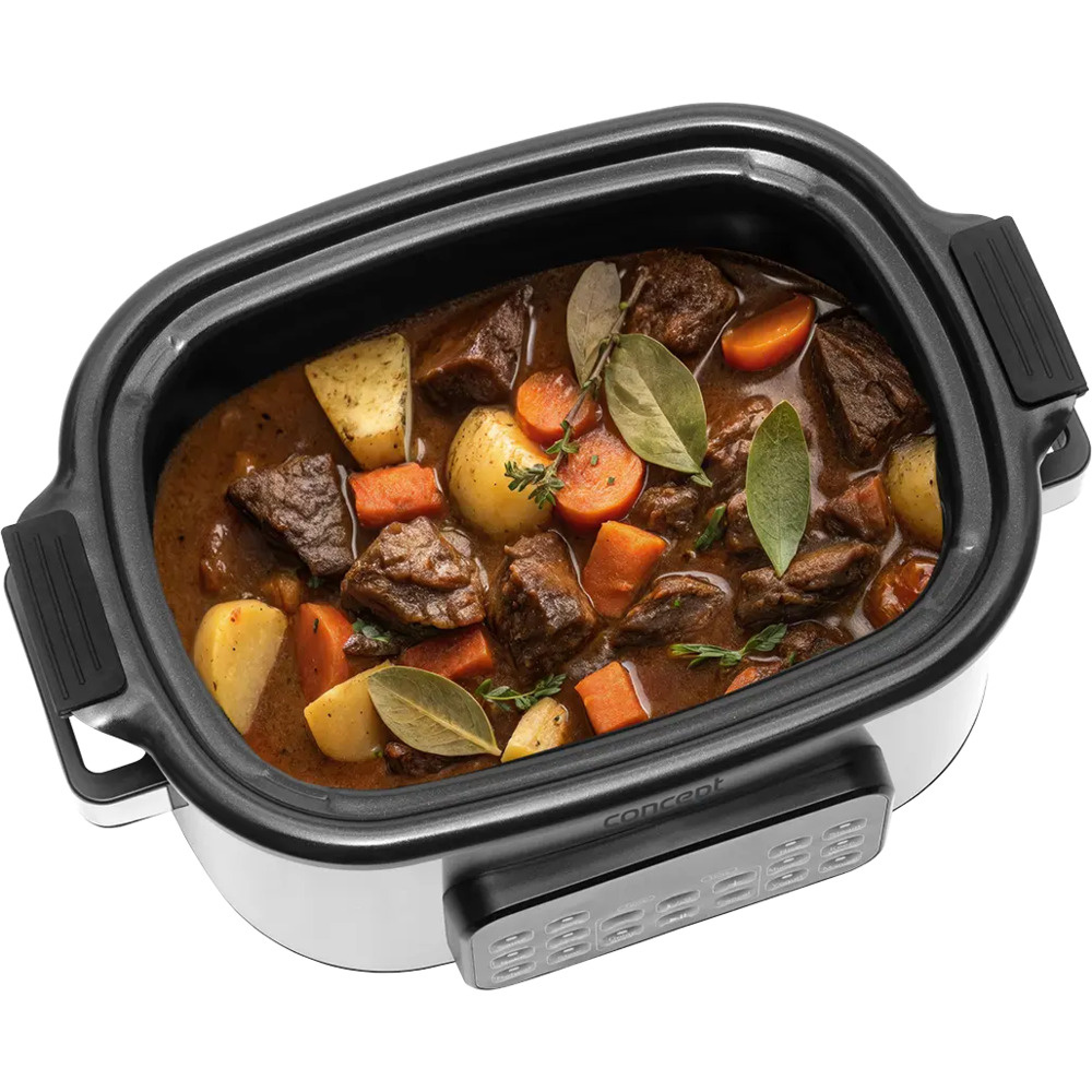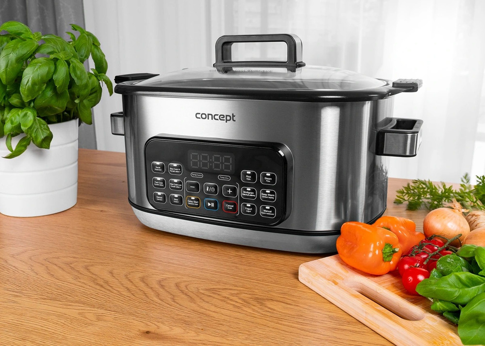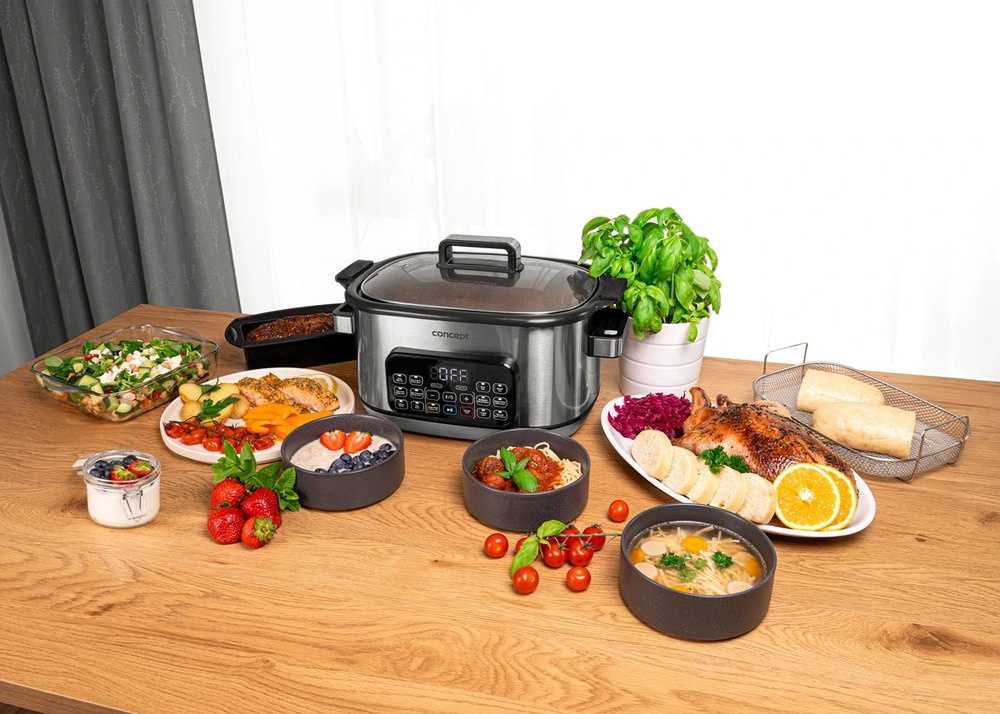 Multifunkčný pomalý hrniec Concept CK9000 je praktický pomocník, ktorý šetrí čas, energiu a miesto na kuchynskej linke. Ponúka 10 automatických programov vrátane pomalého varenia a varenia v pare, takže si ľahko poradí so širokou škálou pokrmov. Pokrievka z tvrdeného skla umožňuje pohodlnú kontrolu varenia bez toho, aby ste ju museli otvárať. Vďaka kompaktným rozmerom sa varič ľahko prenáša - ideálny na chaty alebo dovolenky. Súčasťou balenia je aj mini kuchárka s receptami na jednoduchý začiatok varenia.