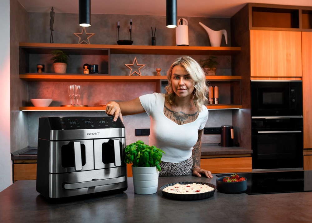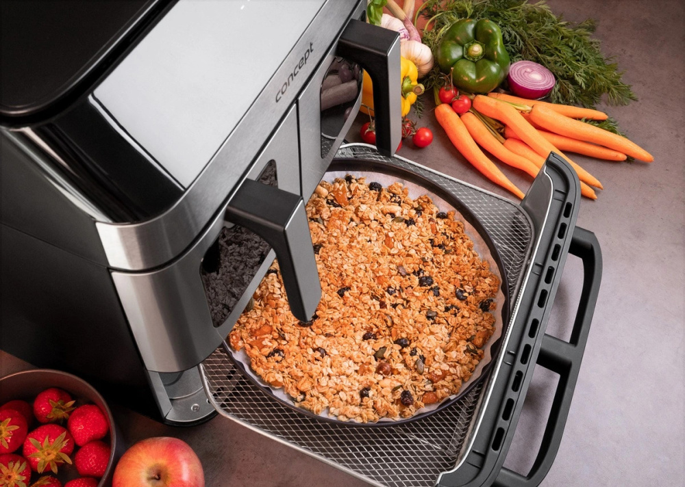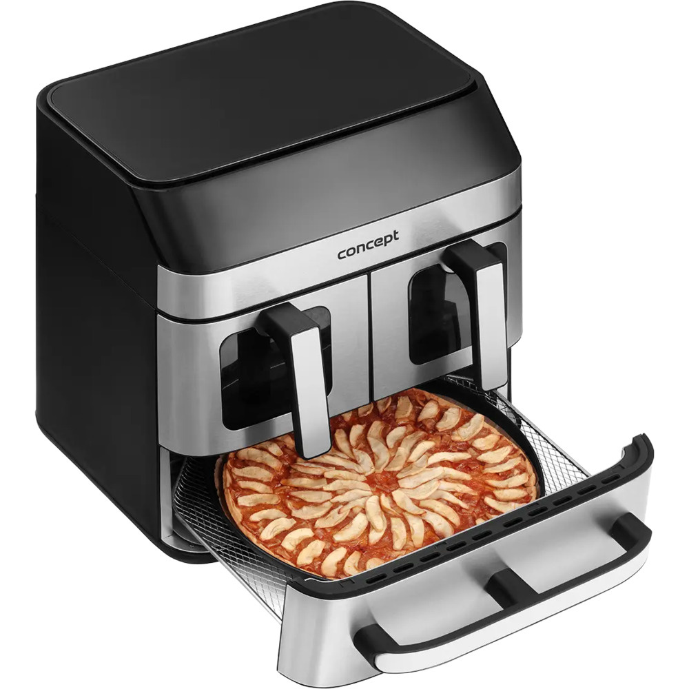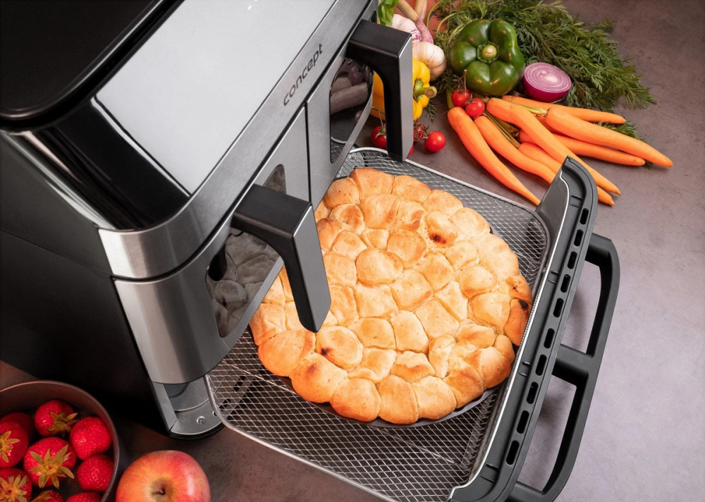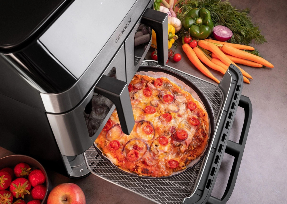 Objavte nový rozmer varenia s teplovzdušnou fritézou PIZZA TRIO Concept FR9000. Tento inovatívny kuchynský pomocník je vybavený jedinečnou multifunkčnou zásuvkou na pečenie, ktorá dosahuje teplotu až 230 °C. S využiteľným priemerom 30 cm a výškou 6 cm ponúka ideálny priestor na prípravu domácej pizze, nadýchaných koláčov, lasagní alebo zapečených cestovín. V porovnaní s bežnou rúrou sa zohrieva až o 70 % rýchlejšie a spotrebuje výrazne menej energie, čo z nej robí úspornú a ekologickú voľbu pre každú modernú domácnosť. Vďaka pokročilej technológii cirkulácie horúceho vzduchu dosiahnete vždy rovnomerné prepečenie a dokonalú chrumkavú kôrku.