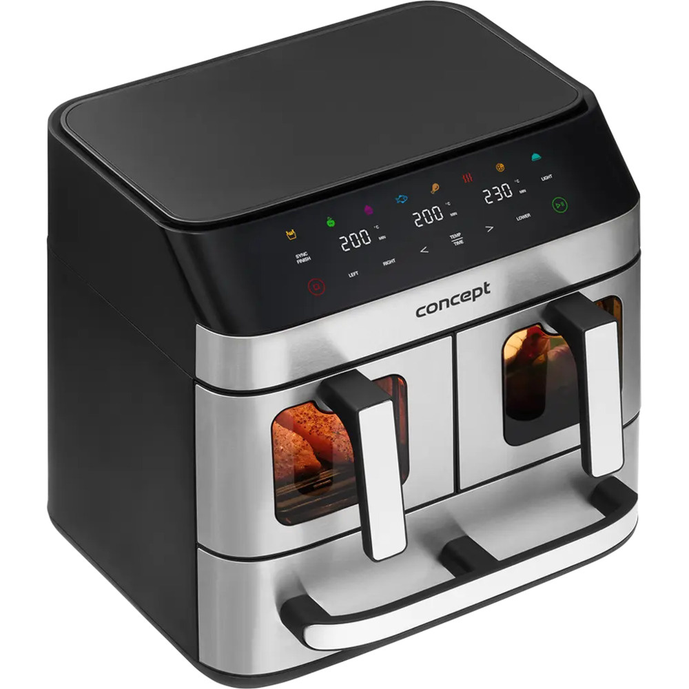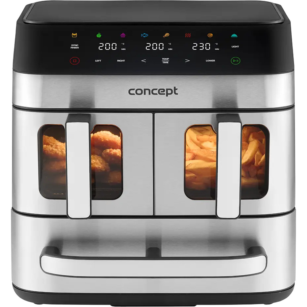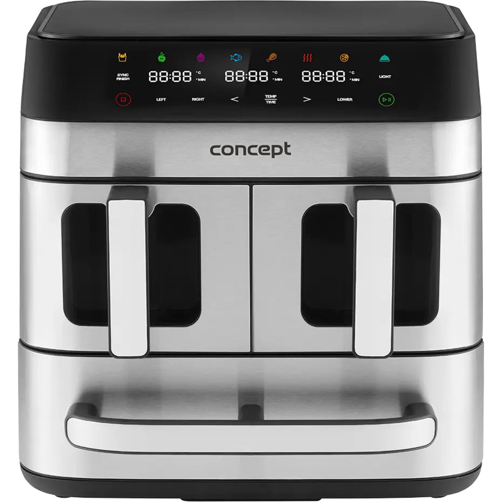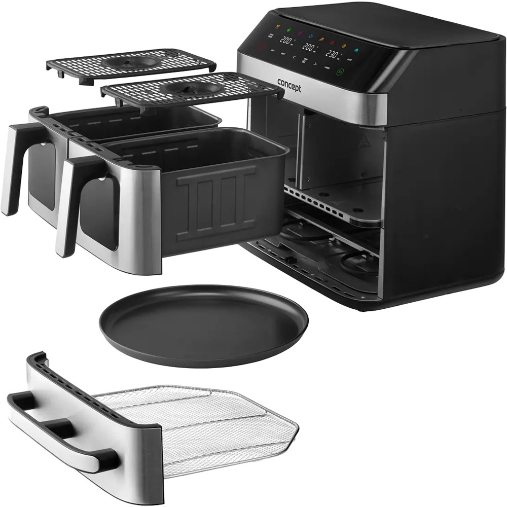 Objavte nový rozmer varenia s teplovzdušnou fritézou PIZZA TRIO Concept FR9000. Tento inovatívny kuchynský pomocník je vybavený jedinečnou multifunkčnou zásuvkou na pečenie, ktorá dosahuje teplotu až 230 °C. S využiteľným priemerom 30 cm a výškou 6 cm ponúka ideálny priestor na prípravu domácej pizze, nadýchaných koláčov, lasagní alebo zapečených cestovín. V porovnaní s bežnou rúrou sa zohrieva až o 70 % rýchlejšie a spotrebuje výrazne menej energie, čo z nej robí úspornú a ekologickú voľbu pre každú modernú domácnosť. Vďaka pokročilej technológii cirkulácie horúceho vzduchu dosiahnete vždy rovnomerné prepečenie a dokonalú chrumkavú kôrku.