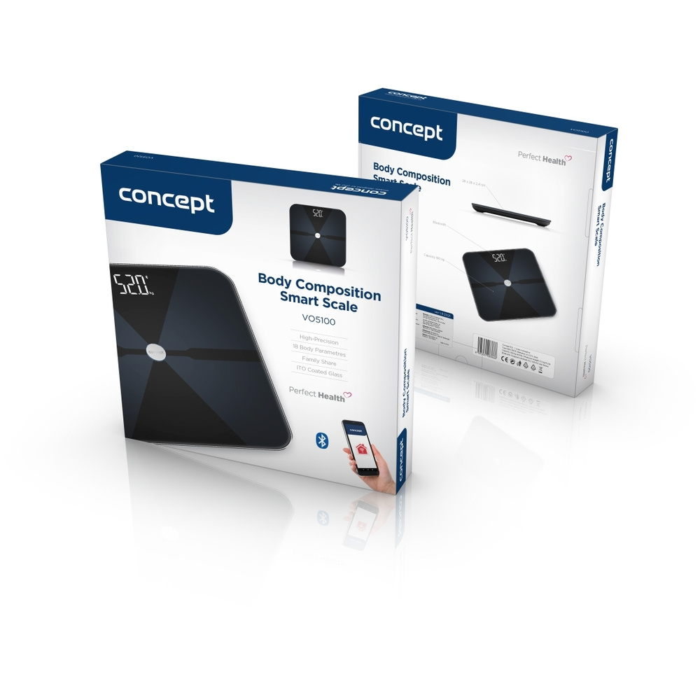 Inteligentná osobná váha Concept VO5100 Perfect Health vám pomôže jednoducho a prehľadne sledovať vaše zdravie. Okrem samotnej telesnej hmotnosti poskytuje aj podrobnú analýzu zloženia tela, vďaka ktorej získate lepšiu predstavu o svojej kondícii a pokroku. Váha má váživosť do 180 kilogramov a meria s presnosťou na 100 g. Elegantný minimalistický dizajn v kombinácii čiernej a tmavomodrej sklenenej dosky s hrúbkou 5 milimetrov a nízke prevedenie z nej robia štýlový doplnok, ktorý prirodzene zapadne do každej kúpeľne či interiéru.