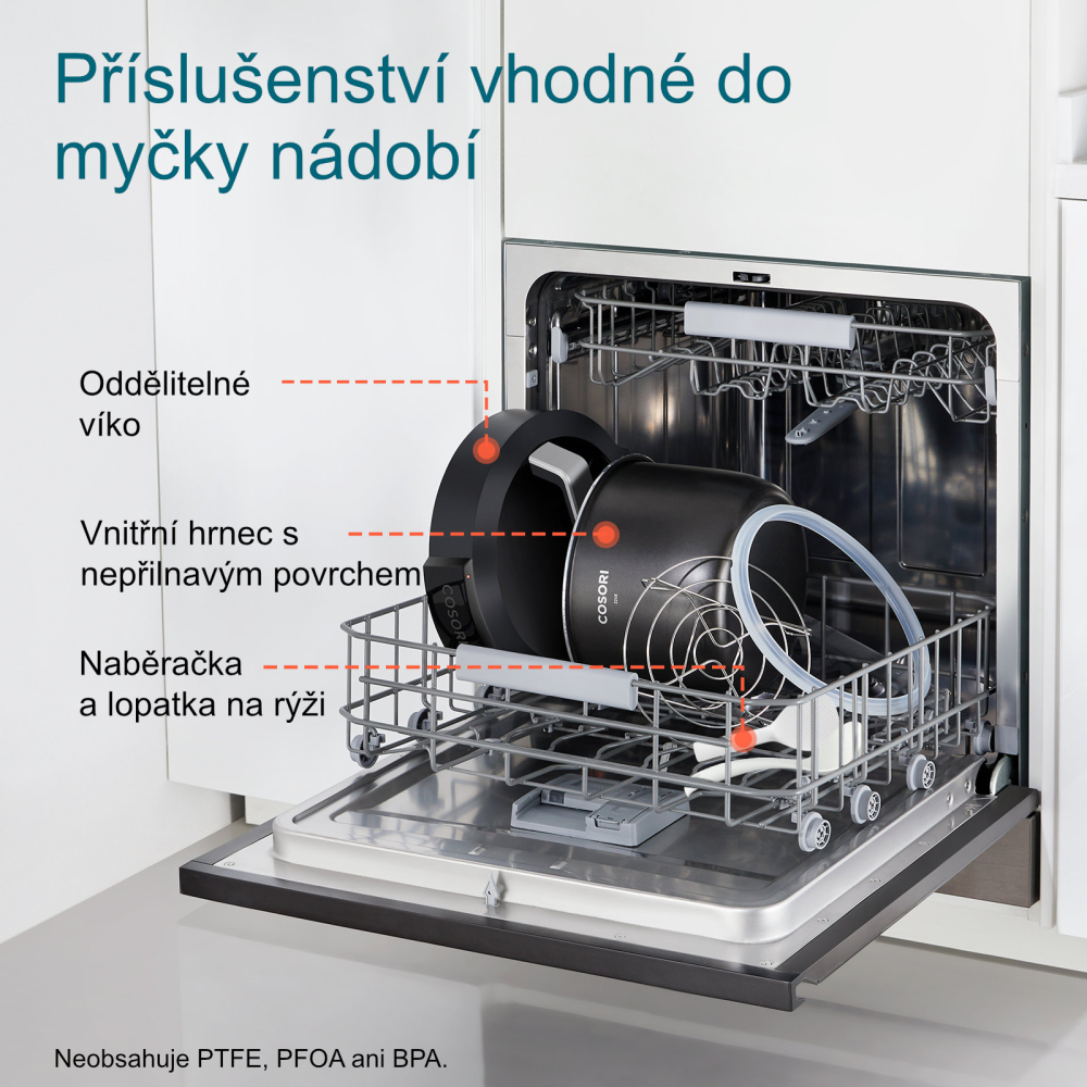 Súčasťou balenia je bohaté príslušenstvo vrátane mriežky na varenie v pare, špeciálnej naberačky na polievku, naberačky na ryžu a praktickej odmerky. Všetky komponenty sú vyrobené z vysokokvalitných materiálov a možno ich umývať v umývačke riadu. Vonkajší plášť z nehrdzavejúcej ocele odoláva odtlačkom prstov a ľahko sa udržiava v čistote. Priložená kniha receptov v českom jazyku a možnosť stiahnuť si ďalšie recepty prostredníctvom QR kódu alebo aplikácie VeSync vás inšpirujú k tvorbe chutných pokrmov.