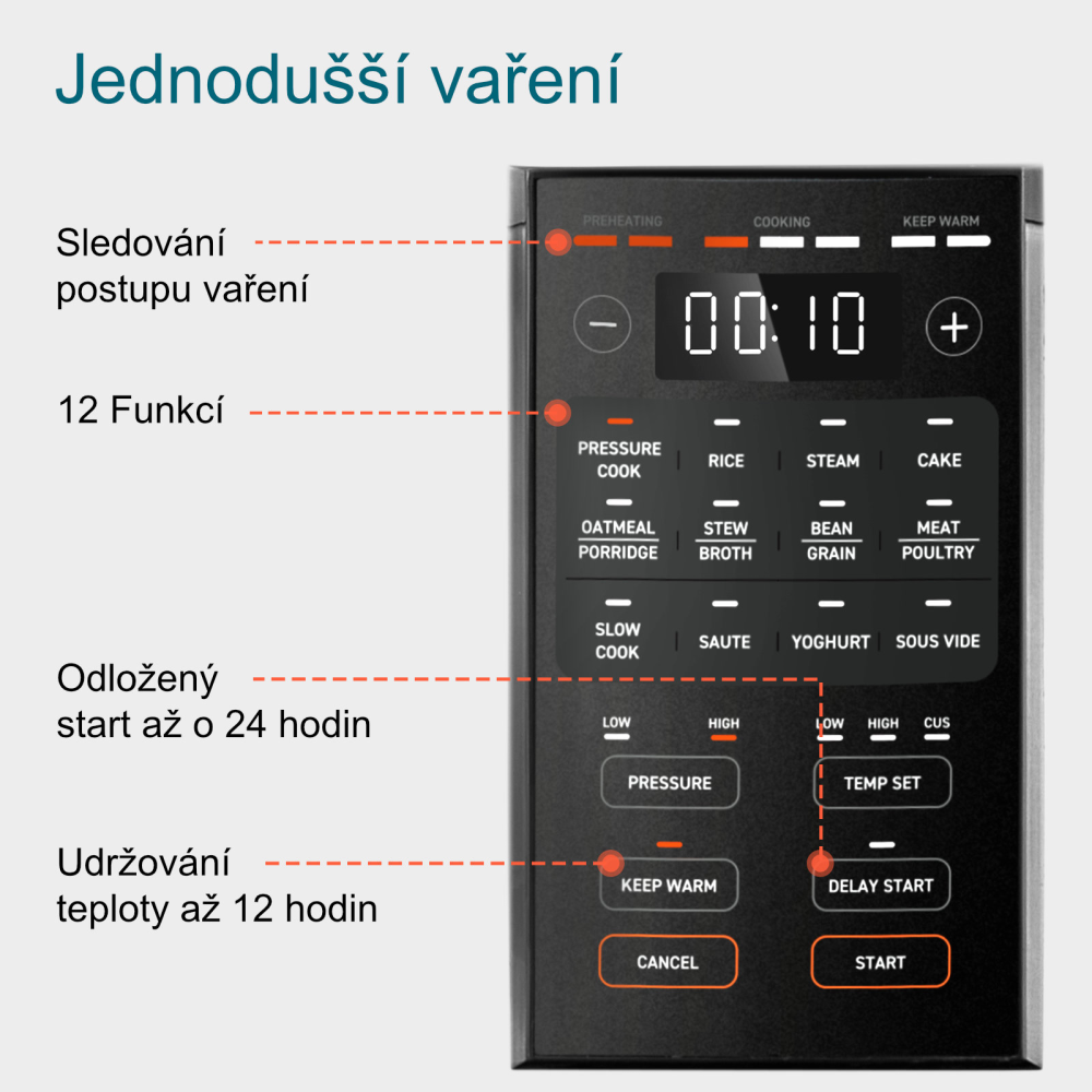 Vďaka 14 prispôsobiteľným programom a prehľadnému dotykovému ovládaniu môže tento sporák používať každý. Spotrebič ponúka 8 režimov tlakového varenia a 5 beztlakových režimov, ktoré uspokoja všetky kulinárske potreby. Zabudovaný časovač, funkcia udržiavania teploty a automatické vypnutie zabezpečujú maximálny komfort pri varení. Prehľadný LCD displej zobrazuje všetky dôležité informácie o procese varenia a umožňuje jednoducho nastaviť čas a teplotu podľa vašich preferencií.