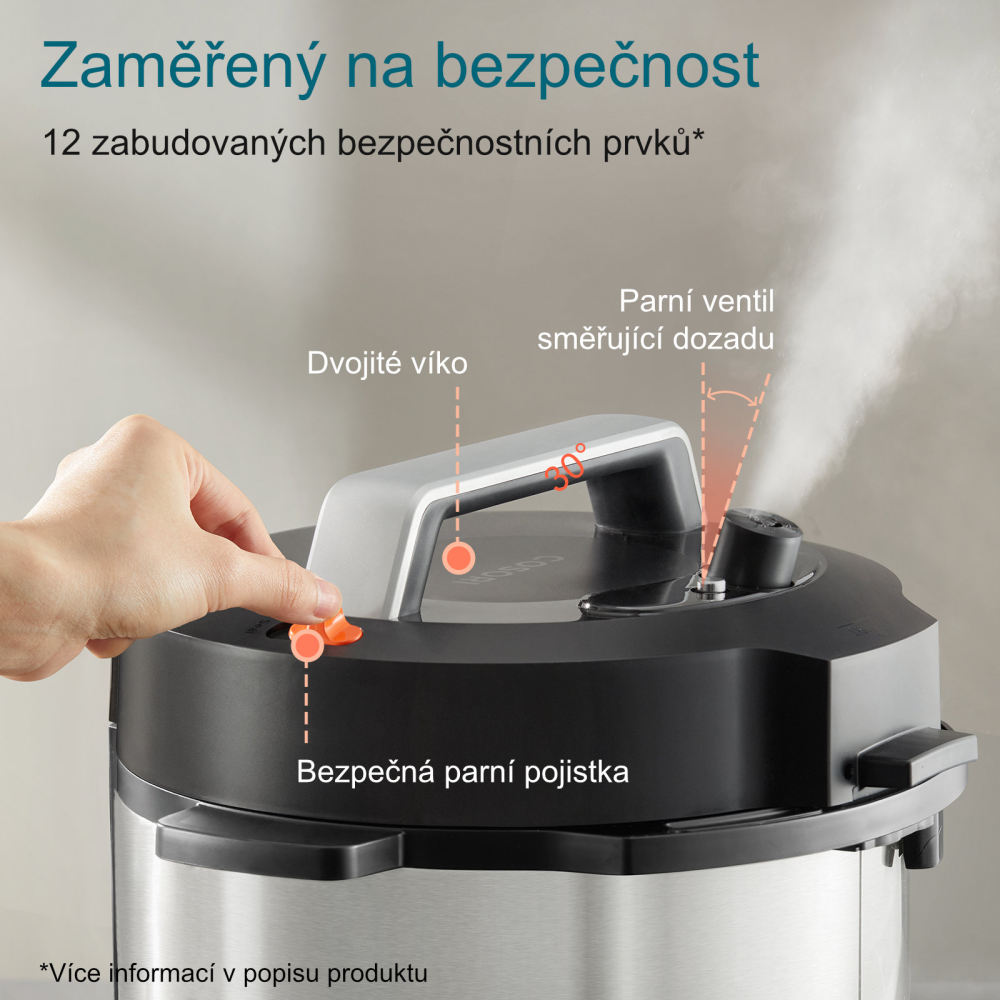 Hrniec má prepracovaný bezpečnostný systém s až 12 bezpečnostnými prvkami. Špeciálne tlačidlo Seal/Vent na bezpečné uvoľnenie pary je umiestnené v optimálnej vzdialenosti od ventilu, ktorý je navrhnutý pod uhlom 30° pre maximálnu ochranu pred popálením. Dvojvrstvové veko účinne zabraňuje popáleniu a integrovaná ochrana proti prehriatiu zaisťuje bezpečnú prevádzku. Vnútorná nádoba s keramickým povrchom neobsahuje škodlivé látky, ako sú BPA, PTFE a PFOA, čo zaručuje zdravú prípravu jedla.