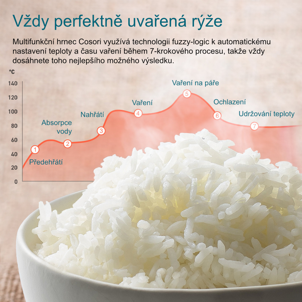 Prehľadný dotykový ovládací panel umožňuje jednoduché nastavenie všetkých funkcií. Pokročilý 7-stupňový proces varenia zahŕňa presnú reguláciu teploty, optimalizáciu vlhkosti, automatické nastavenie času a inteligentné riadenie celého procesu varenia. Hrniec ponúka špecializované programy pre rôzne druhy ryže, pomalé varenie, varenie v pare, dusenie a pečenie. Praktické funkcie odloženého štartu a udržiavania teploty prispôsobia prípravu jedla vášmu každodennému režimu.