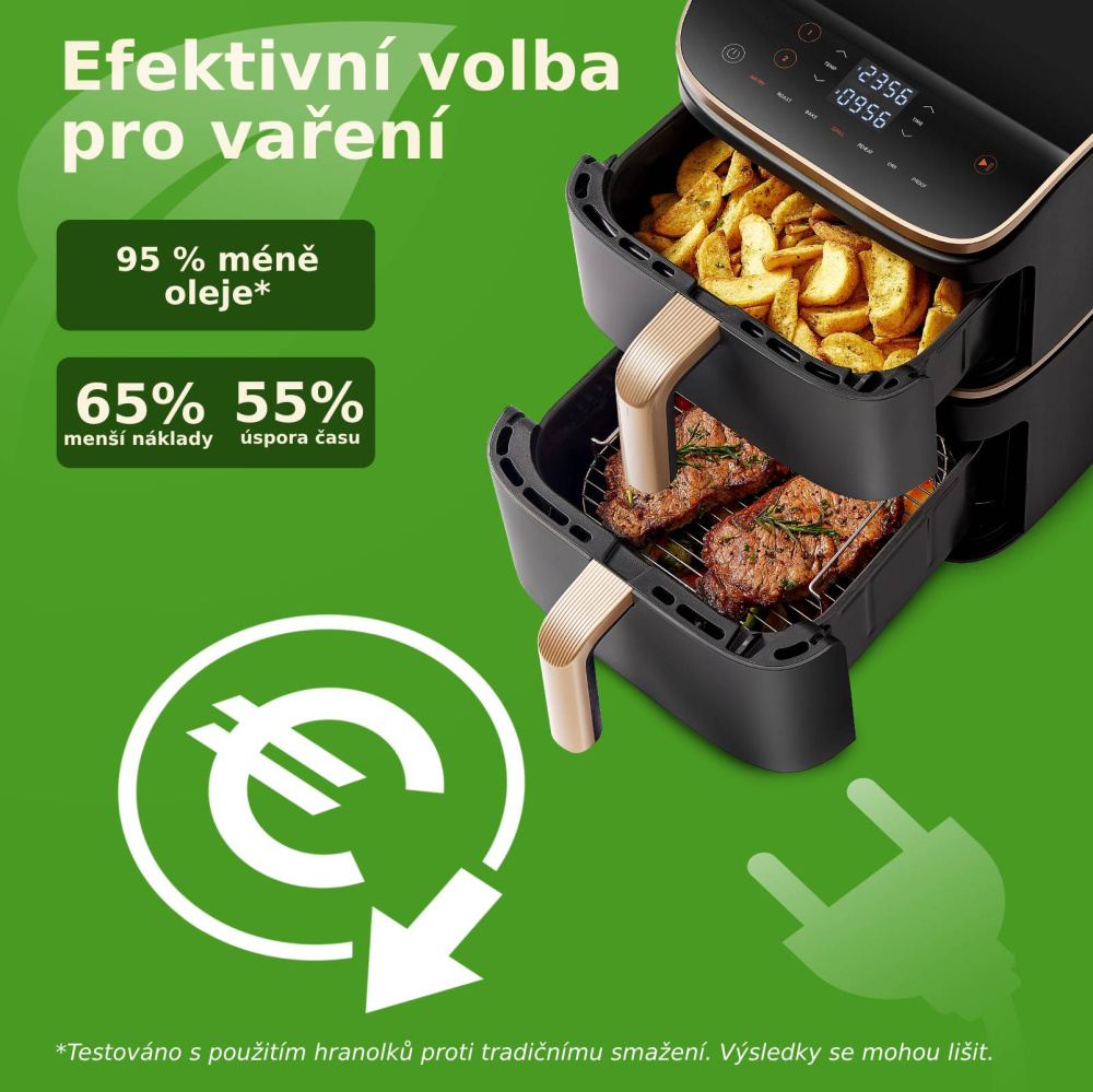 COSORI Turbo Tower Pro Smart využíva pokročilú technológiu Dual Blaze, ktorá kombinuje tri výhrevné telesá (jedno pre horný kôš a dve pre spodný kôš) a dva ventilátory DC s celkovým výkonom 2630 W. Táto jedinečná kombinácia zabezpečuje maximálne rovnomerné zhnednutie a eliminuje potrebu častého otáčania alebo pretrepávania surovín. Perforované koše, ktoré prepúšťajú až 50 % horúceho vzduchu, zabezpečujú dokonalú cirkuláciu tepla okolo potravín. Fritéza dosahuje maximálnu teplotu 230 °C, čo je ideálne na domáce grilovanie a dokonalé výsledky prípravy pokrmov. Vďaka technológii Dual Blaze bude vaše jedlo vždy dokonale zlatisté a chrumkavé, a to pri nákladoch nižších až o 65 % a čase prípravy kratšom o 55 % v porovnaní s bežnými rúrami.