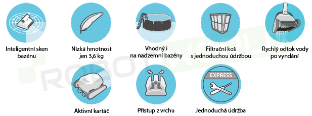 - Aktívna kefa, ktorá odstraňuje riasy a baktérie z bazéna