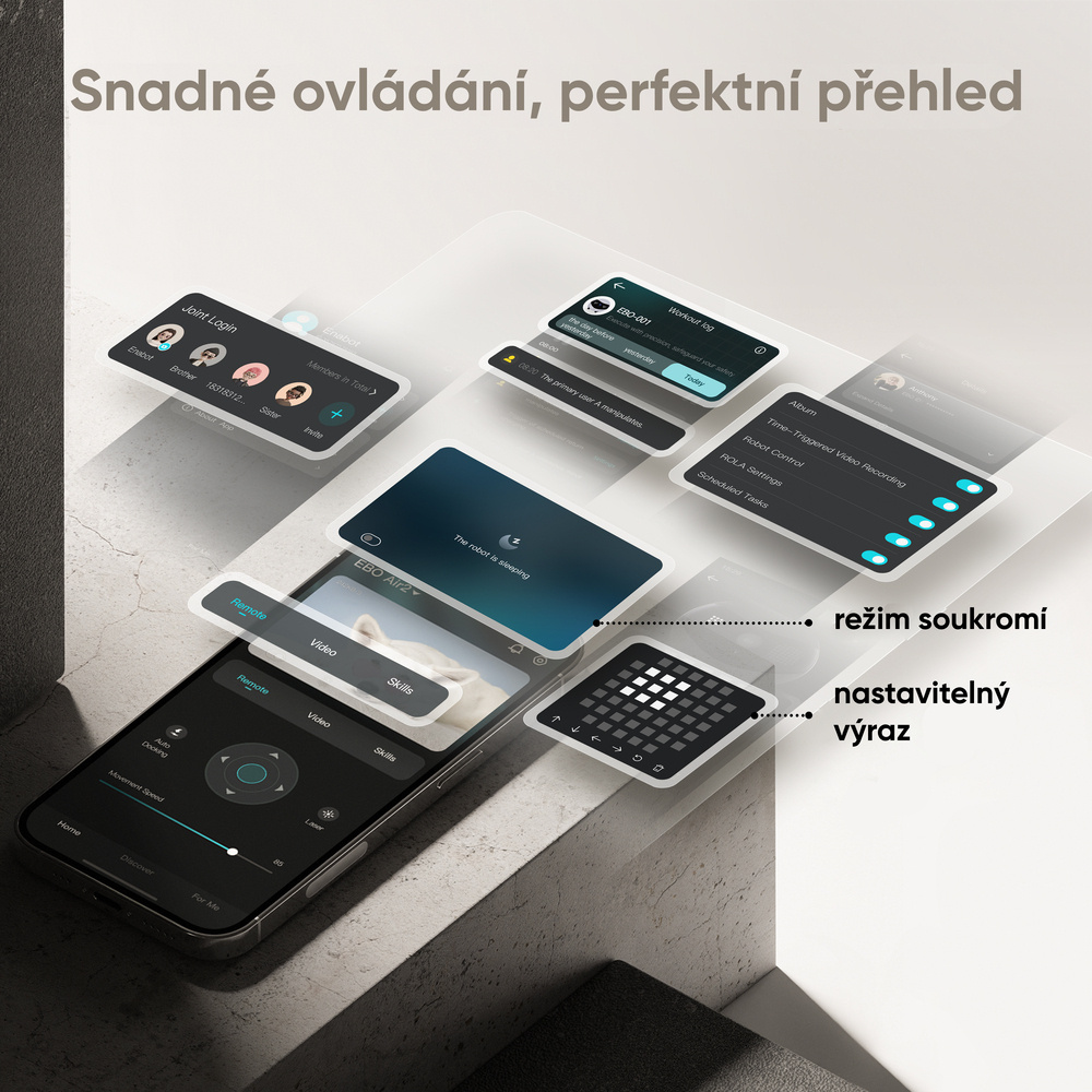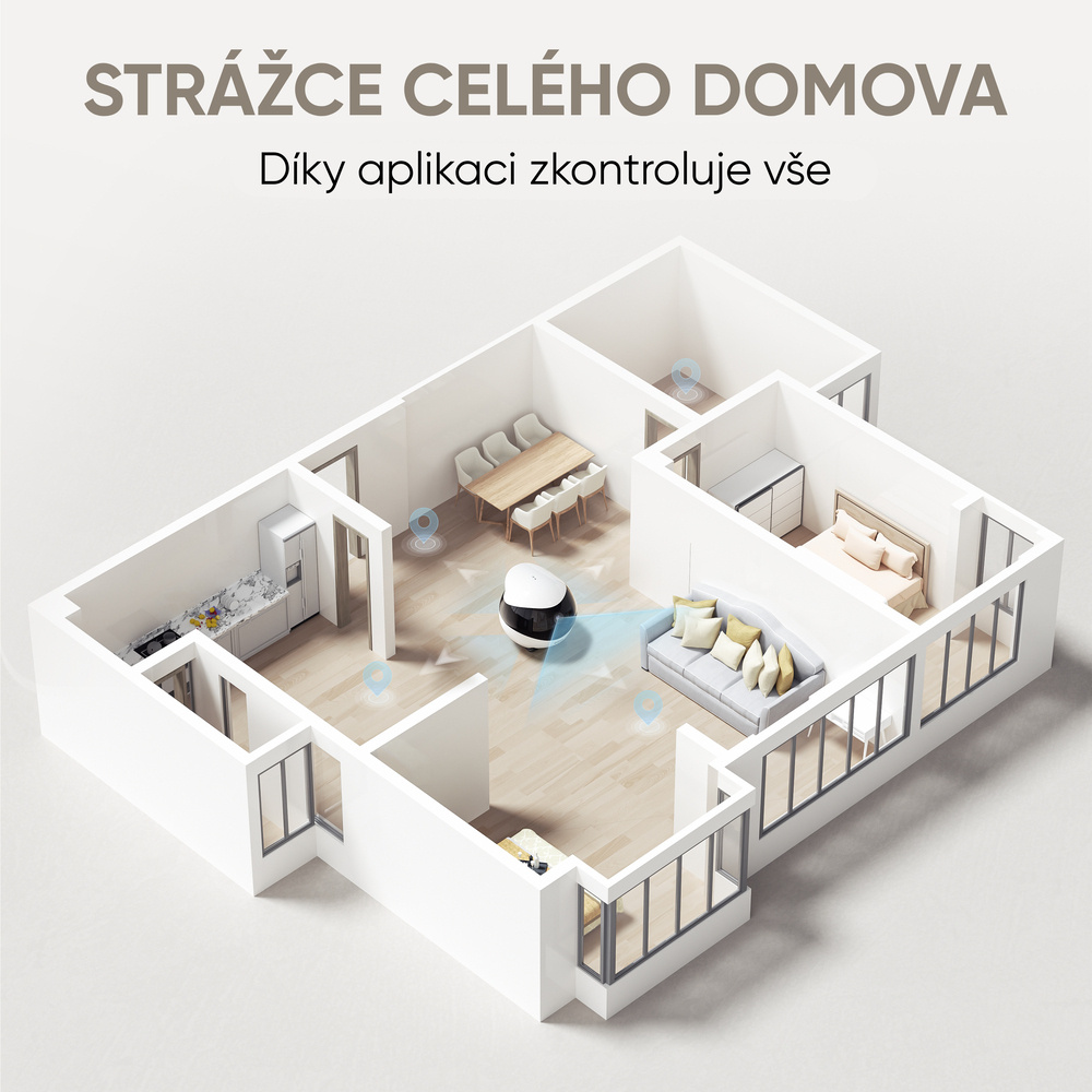Kamera EBO Air 2 sa môže voľne pohybovať po celom dome, čím poskytuje oveľa širší záber ako bežné statické kamery. Vďaka pásovému podvozku sa môže hladko pohybovať po hladkých podlahách a kobercoch a reagovať na vaše pokyny v aplikácii. Vďaka tomu je možné ľahko skontrolovať každú miestnosť alebo konkrétnu situáciu bez toho, aby ste museli byť fyzicky doma, a v prípade akýchkoľvek abnormalít odošle oznámenie. Táto mobilita dáva používateľovi skutočný pocit prítomnosti - odkiaľkoľvek na svete. Pre väčšiu flexibilitu môžu jedného robota v aplikácii zdieľať viacerí používatelia, čo je ideálne pre celú rodinu . Vďaka svojej konštrukcii dokáže robot prekonávať prekážky a prahy vysoké až 6 mm, čo mu umožňuje ľahký pohyb medzi rôznymi povrchmi v domácnosti.