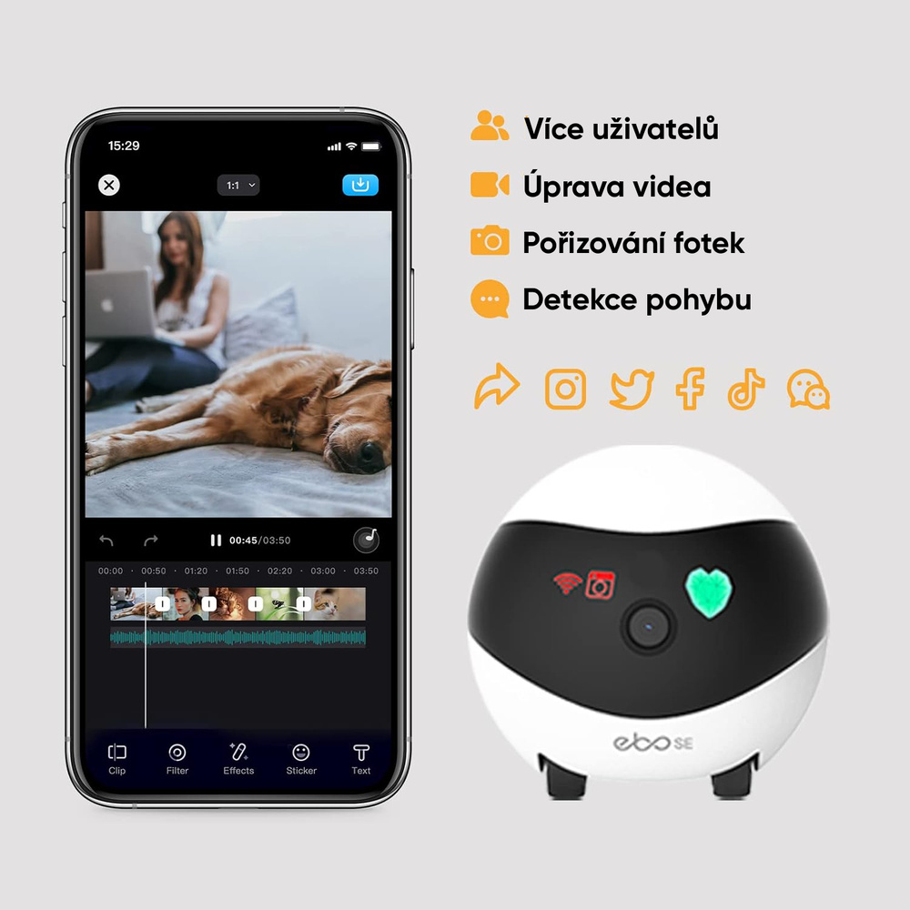 EBO SE prináša zábavu domácim zvieratám a deťom, ktoré sa s ním môžu hrať a komunikovať v reálnom čase. Vďaka pohybu, zvukom a hlasovej komunikácii reaguje na podnety a udržiava vašich domácich miláčikov aktívnych aj počas vašej neprítomnosti. Je to ideálny spoločník, ktorý pomáha prekonať nudu a osamelosť a zároveň vám poskytuje istotu, že doma je všetko v poriadku. Vďaka interaktívnej povahe robota je EBO SE viac než len kamera - je to priateľský člen domácnosti, ktorý spája zábavu, praktické funkcie a bezpečnosť v jednom kompaktnom zariadení.