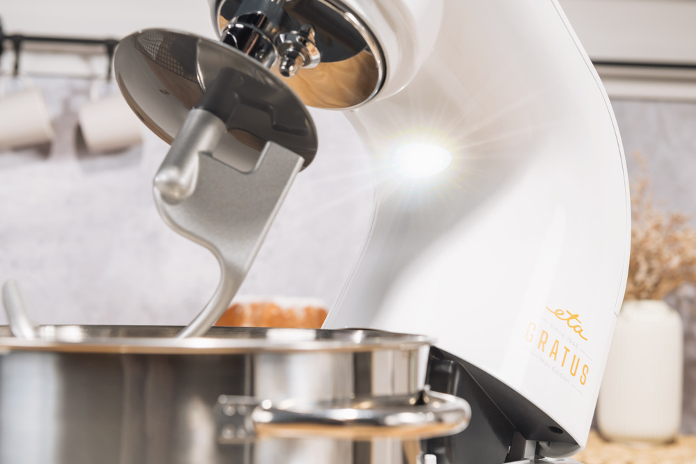 - Inovatívny šľahací nadstavec s predĺženou pracovnou časťou zabezpečuje efektívnejšie miešanie surovín aj pri stenách misy
