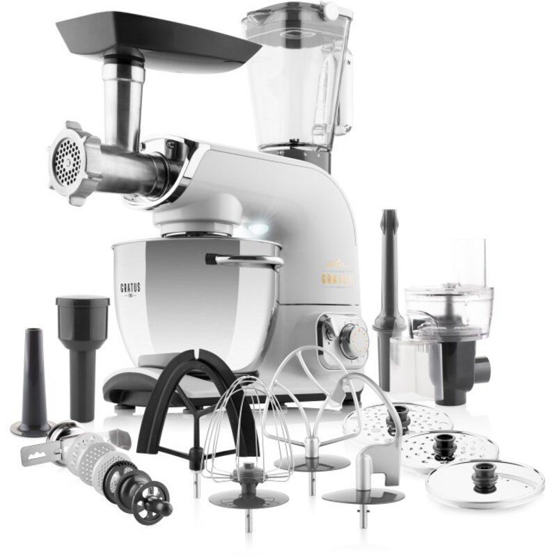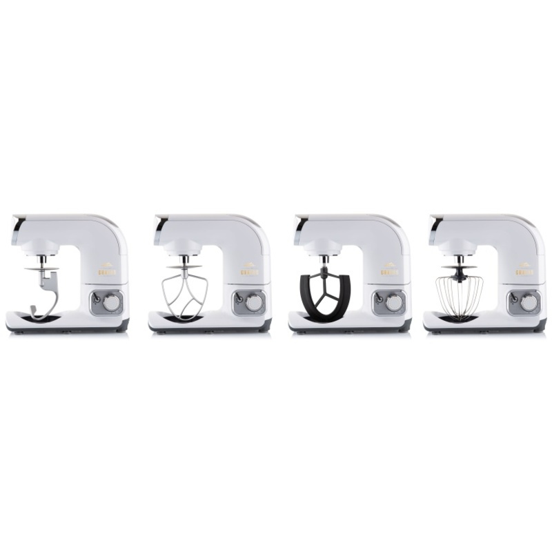 - Príslušenstvo v balení: flexi šľahač, hnetací hák, miešacia metla, mixér, mlynček na mäso, progresívny krájač, priehľadný kryt misy, šľahacia metla, cukrárenské náradie