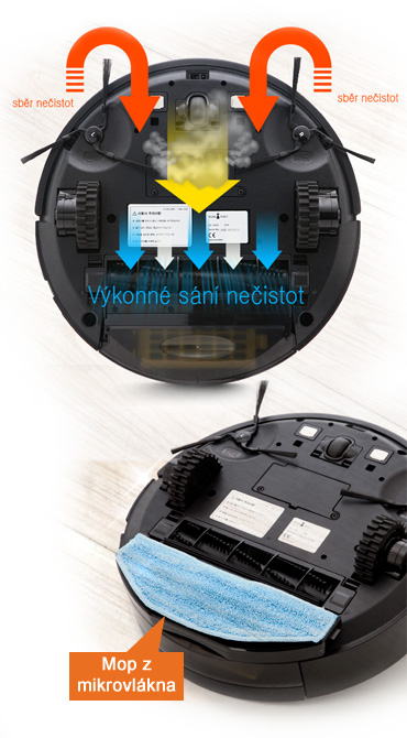 Vo vnútri robota sa nachádza výkonný sací motor, ktorý nasáva prach a nečistoty do prachovej nádoby. Účinný HEPA filter zachytáva aj tie najjemnejšie mikročastice prachu, aby neunikali späť do ovzdušia.