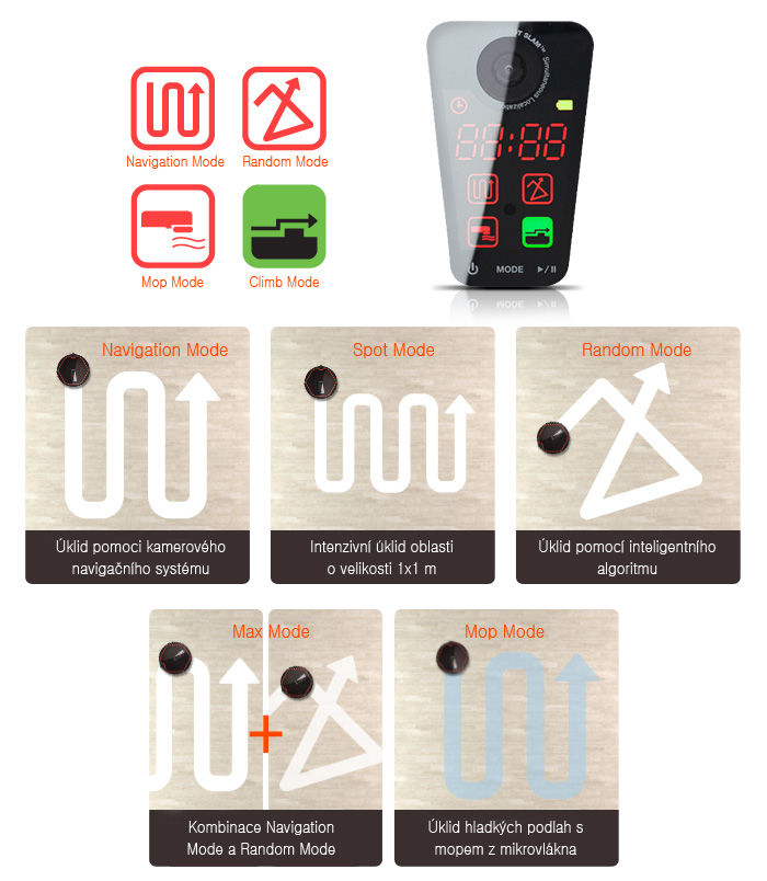 - Režimy čistenia: automatický, náhodný, bodový, maximálny, stúpanie mopu, manuálny