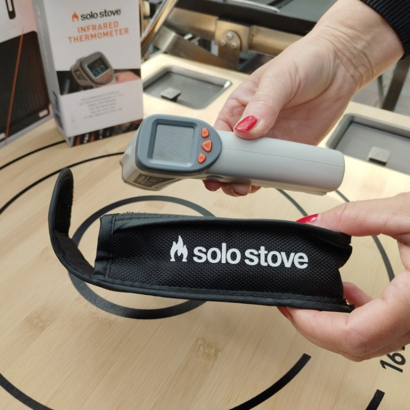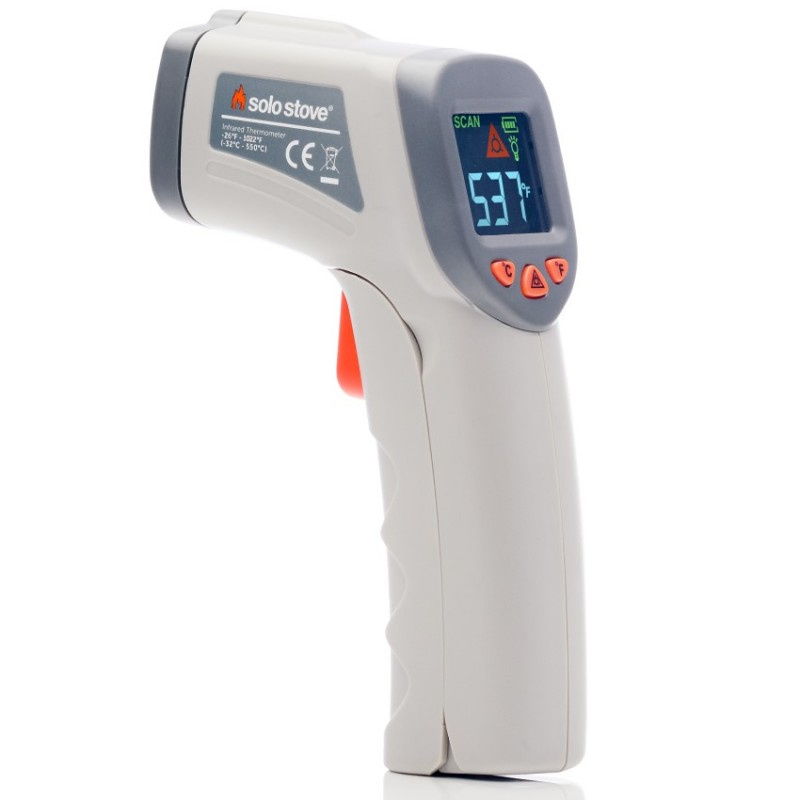 Bezkontaktný infračervený digitálny teplomer Solo Stove na presné meranie teploty počas grilovania. Teplotu môžete vidieť na farebnom displeji prakticky okamžite po namierení na objekt a stlačení tlačidla. Vďaka podsvietenému displeju nebudete mať problém s čítaním teplomera ani pri večernom grilovaní. Automatické vypnutie teplomera znižuje spotrebu energie. Teplomer v tvare pištole sa veľmi ľahko drží a manipuluje. Infračervený lúč nesmerujte do očí - nie je určený na meranie teploty u ľudí alebo zvierat.