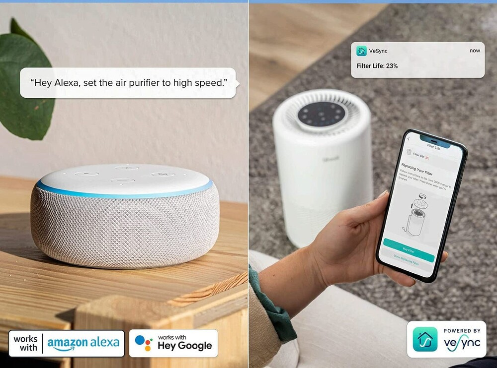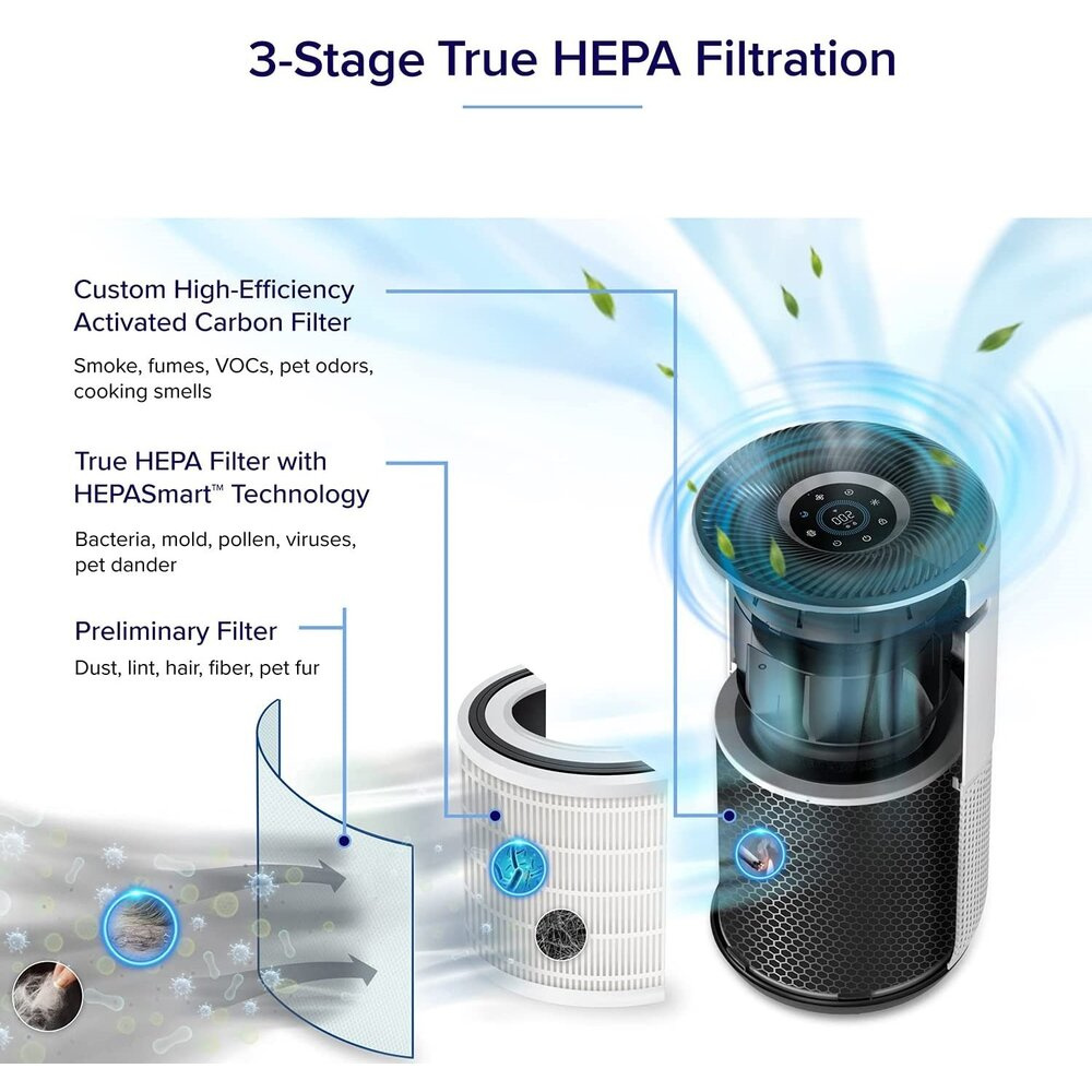 Čistiaci systém pracuje v troch krokoch pre maximálnu účinnosť. Vonkajší nylonový filter zachytáva hrubé častice, ako sú vlasy, prach alebo žmolky. HEPA filter potom odstraňuje jemné prachové častice, baktérie, plesne, peľ, častice dymu a roztoče. Posledný uhlíkový filter odstraňuje pachy, dym a výpary. Celková účinnosť dosahuje 99,97 % a zachytáva častice s veľkosťou 0,3 mikrónu. Stav filtra môžete pohodlne sledovať prostredníctvom aplikácie v smartfóne alebo tablete.