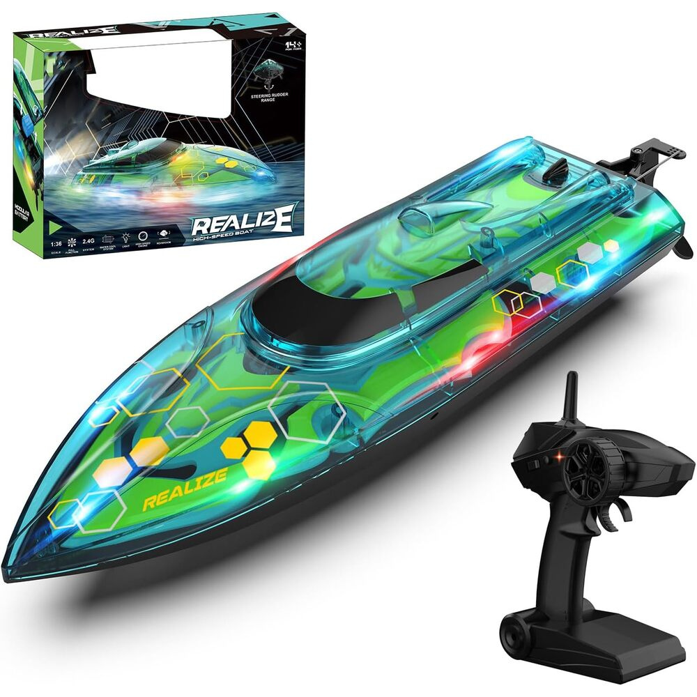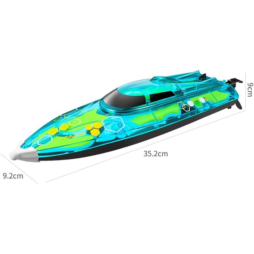 Diaľkovo ovládaný pretekársky čln Ssccgym h155 je zelený rýchlostný čln s celotelovým LED osvetlením, ktorý na vode dosahuje rýchlosť 20-28 km/h. Model je určený pre nadšencov od 14 rokov a ponúka presné ovládanie prostredníctvom systému 4CH 2.4G s dosahom až 150 metrov. Plavidlo s rozmermi 35,2 x 9,2 x 9 cm má vodotesný trup z nárazuvzdorného ABS plastu s modulárnou konštrukciou proti náklonu, ktorá zabezpečuje stabilitu aj pri vyšších rýchlostiach. Ovládacie prvky v tvare pištole umožňujú pohyb dopredu, dozadu, doľava, doprava vrátane presného otáčania o 180° , zatiaľ čo inteligentný systém automaticky vyšle alarm v prípade prekročenia vzdialenosti alebo vybitia batérie. Napájanie zabezpečuje 7 ,4 V 600 mAh lítiová batéria s 20-minútovou dobou plavby a 180-minútovým nabíjaním pomocou priloženého USB kábla s ochranou. Zabudovaný systém vodného chladenia chráni motor pred prehriatím počas pretekov. V balení nájdete loď s ovládačom, nabíjací kábel, náhradnú vrtuľu s priemerom 2,9 cm, stojan a návod. Ovládač vyžaduje 2x batérie AA 1,5 V, ktoré nie sú súčasťou balenia. Tento model v mierke 1 :28 je ideálnou voľbou pre jazerá, rybníky a bazény.