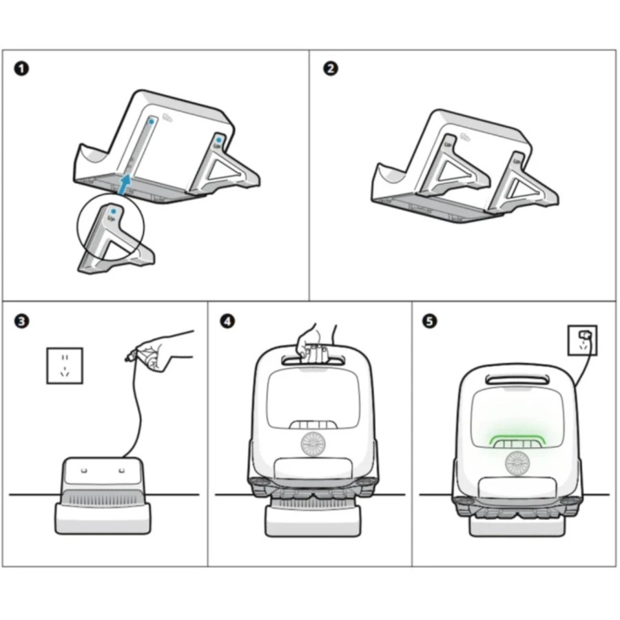 Jeho vzpriamená poloha uľahčuje manipuláciu, zatiaľ čo jeho kompaktný dizajn šetrí miesto a udržiava poriadok v priestore bazéna. Zároveň chráni robota, keď sa nepoužíva. Inštalácia je rýchla a jednoduchá, bez použitia náradia alebo zložitého nastavovania.