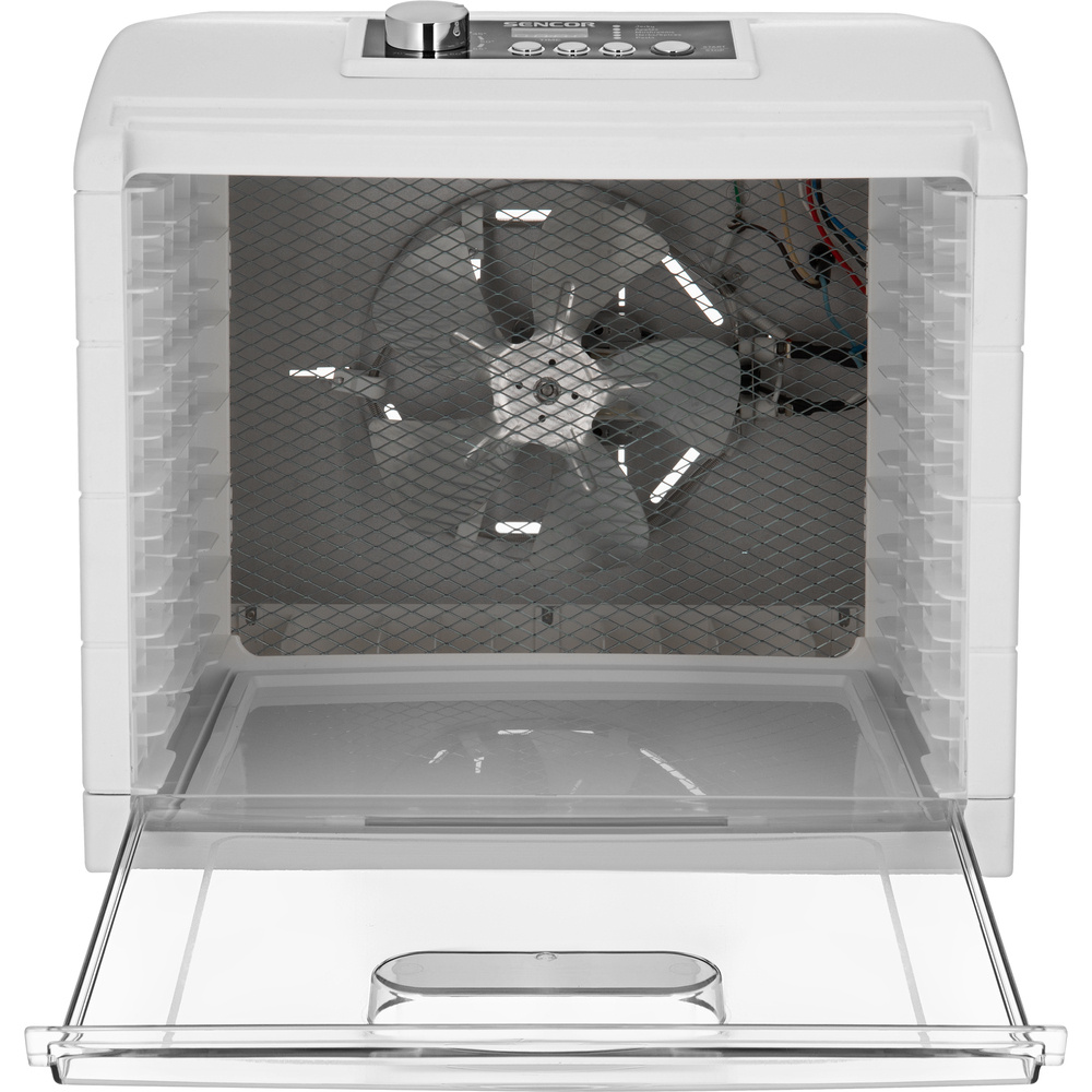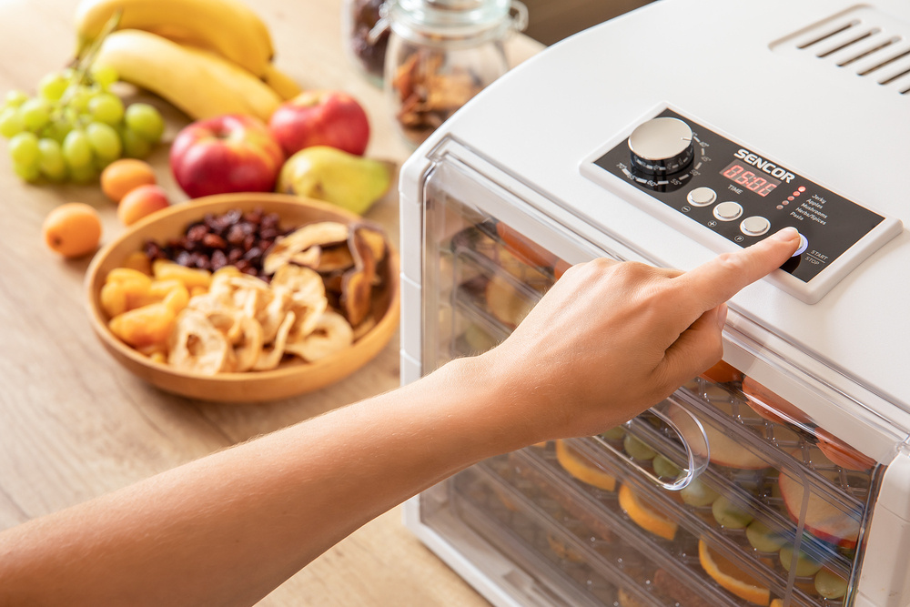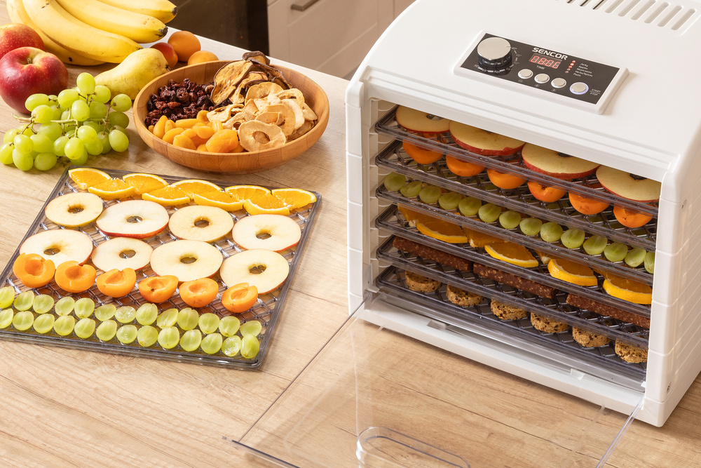 SENCOR SFD 6500WH ponúka sušiacu plochu 0,59 m², čo je o 33 % viac ako bežné sušičky s priemerom 32 cm. Šesť vyberateľných plastových podnosov umožňuje naraz spracovať až 3 kg surovín (500 g na podnos). Vďaka kompaktným rozmerom je vhodná do každej kuchyne.