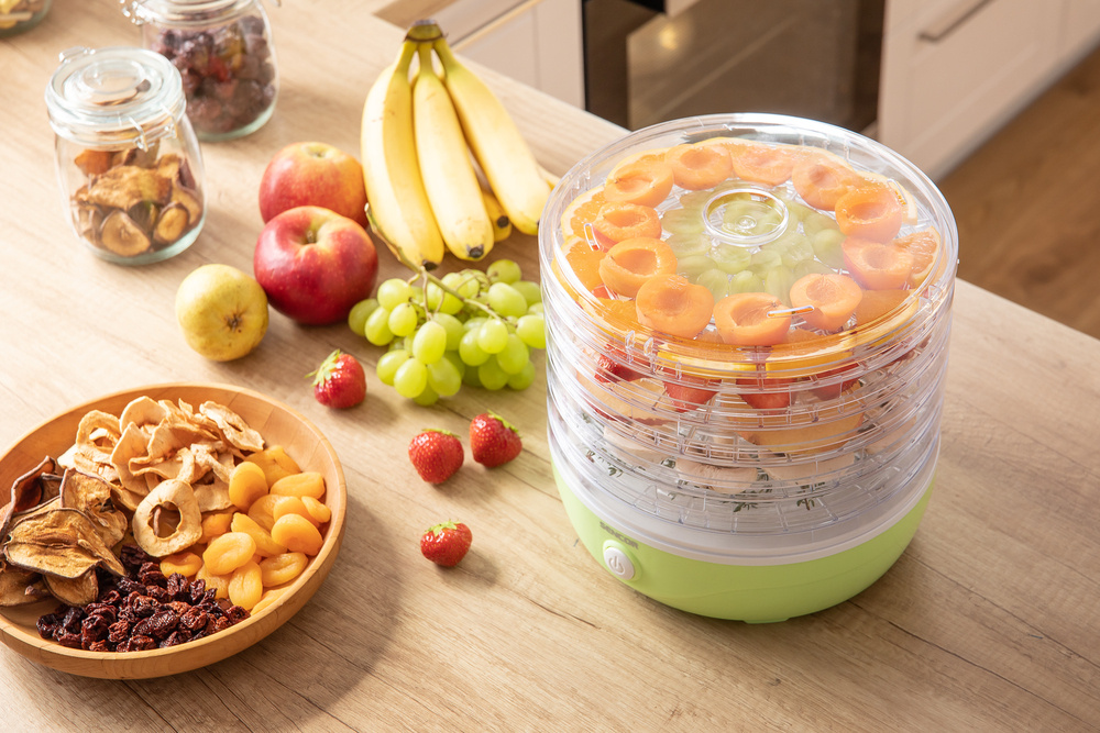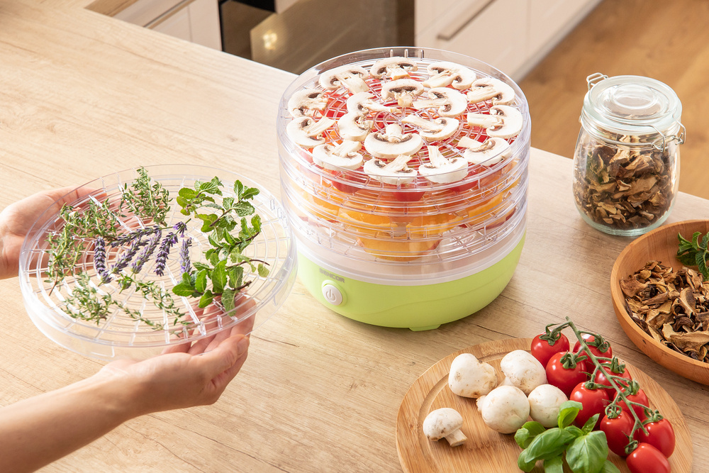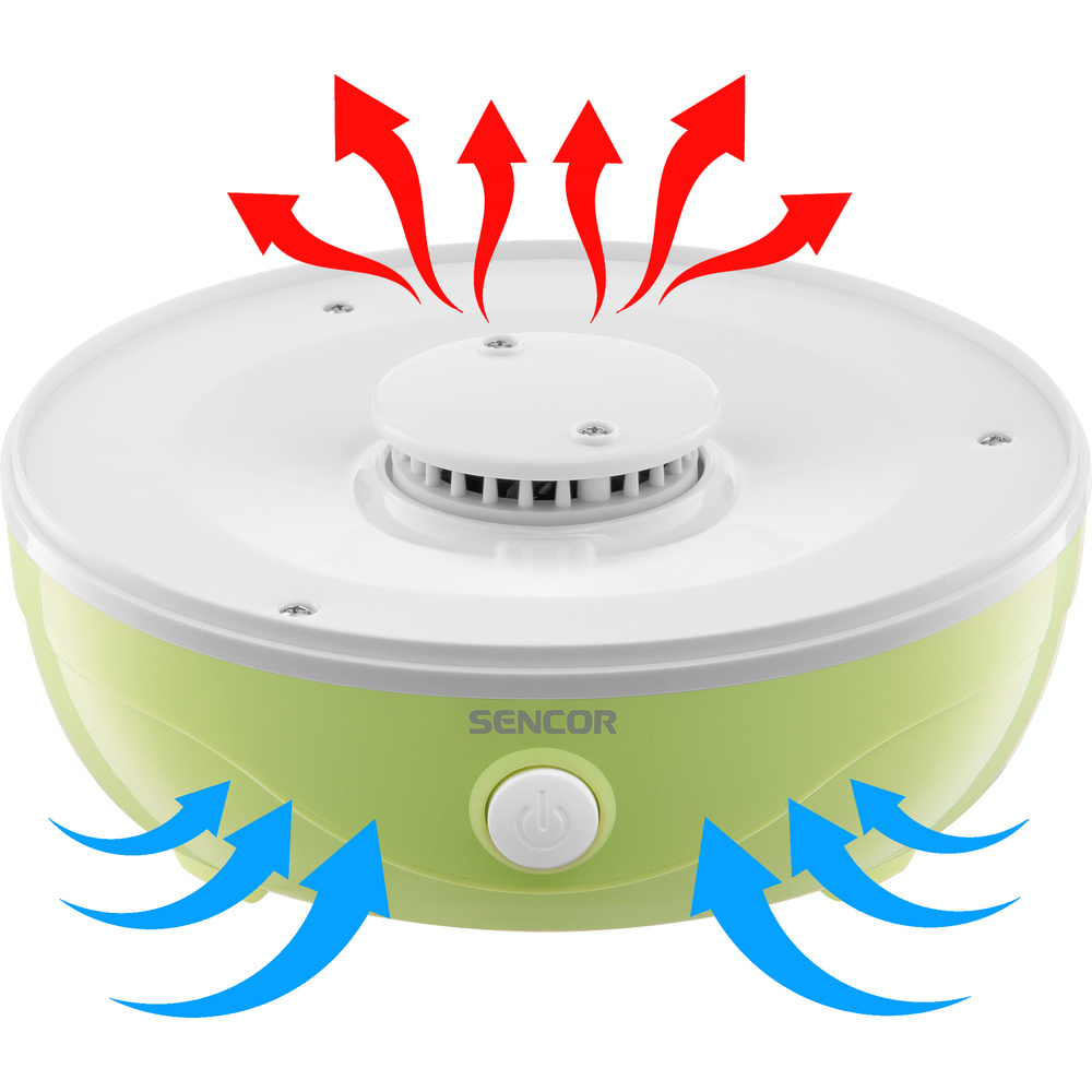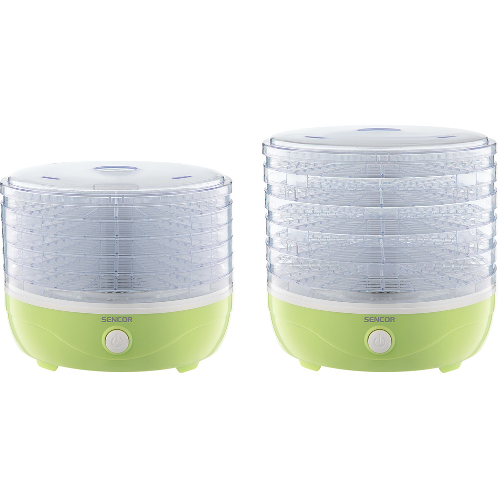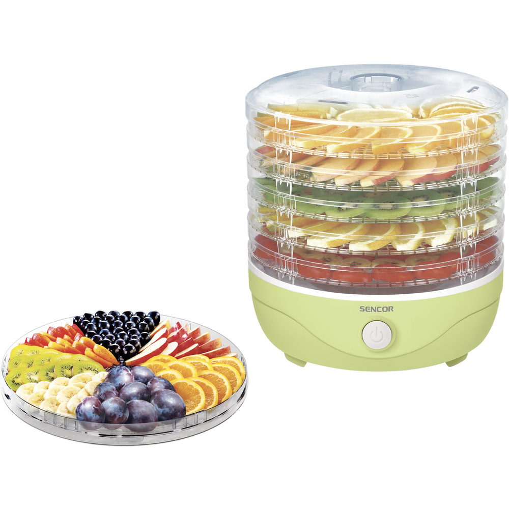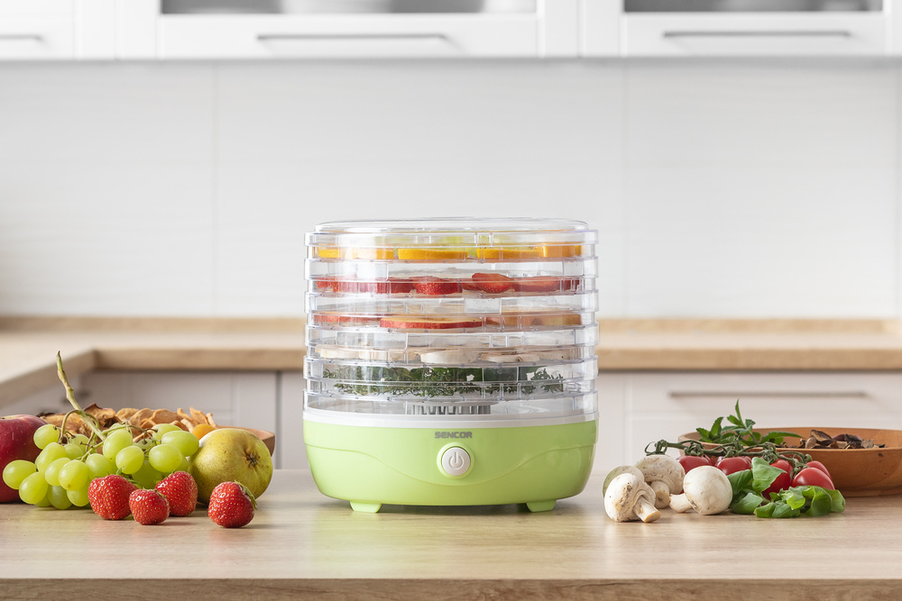 SENCOR SFD 757GG ponúka päť praktických dosiek s priemer om 23 cm a nastaviteľnou výškou do 2,5 cm. Vďaka možnosti použitia len z jedného plata je sušička veľmi flexibilná. Zabudovaný ventilátor zabezpečuje optimálnu cirkuláciu horúceho vzduchu do všetkých poschodí sušičky, zatiaľ čo špeciálna konštrukcia platní umožňuje efektívne prúdenie vzduchu a rovnomerné sušenie všetkých surovín.