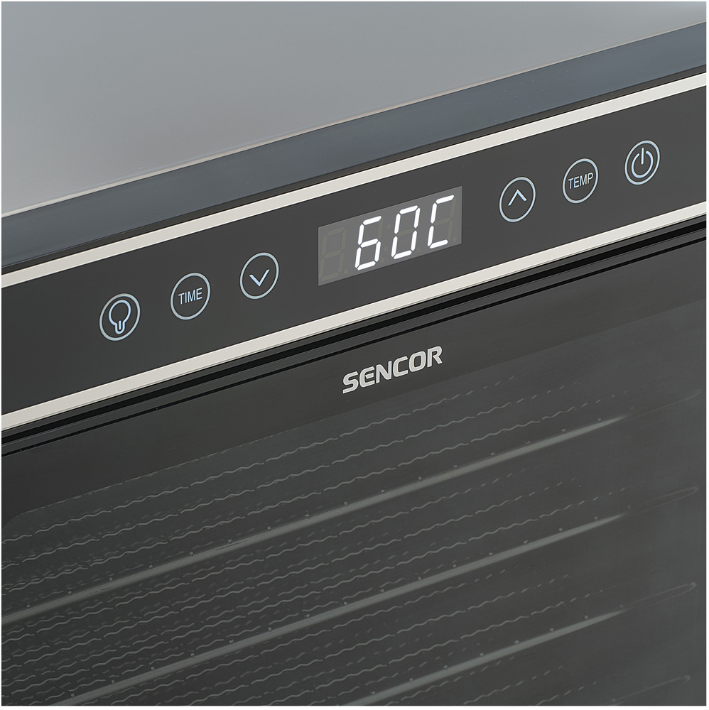 Elektronický ovládací panel s LED displejom umožňuje nastavenie teploty v rozsahu 35-70 °C. SFD 6601BK ponúka širokú škálu využitia - od prípravy ovocných lupienkov, sušených byliniek, domácich sušienok až po RAW pokrmy na špeciálnom plnom zásobníku. Vďaka regulácii nízkej teploty je vhodný aj na prípravu pochúťok pre domáce zvieratá.