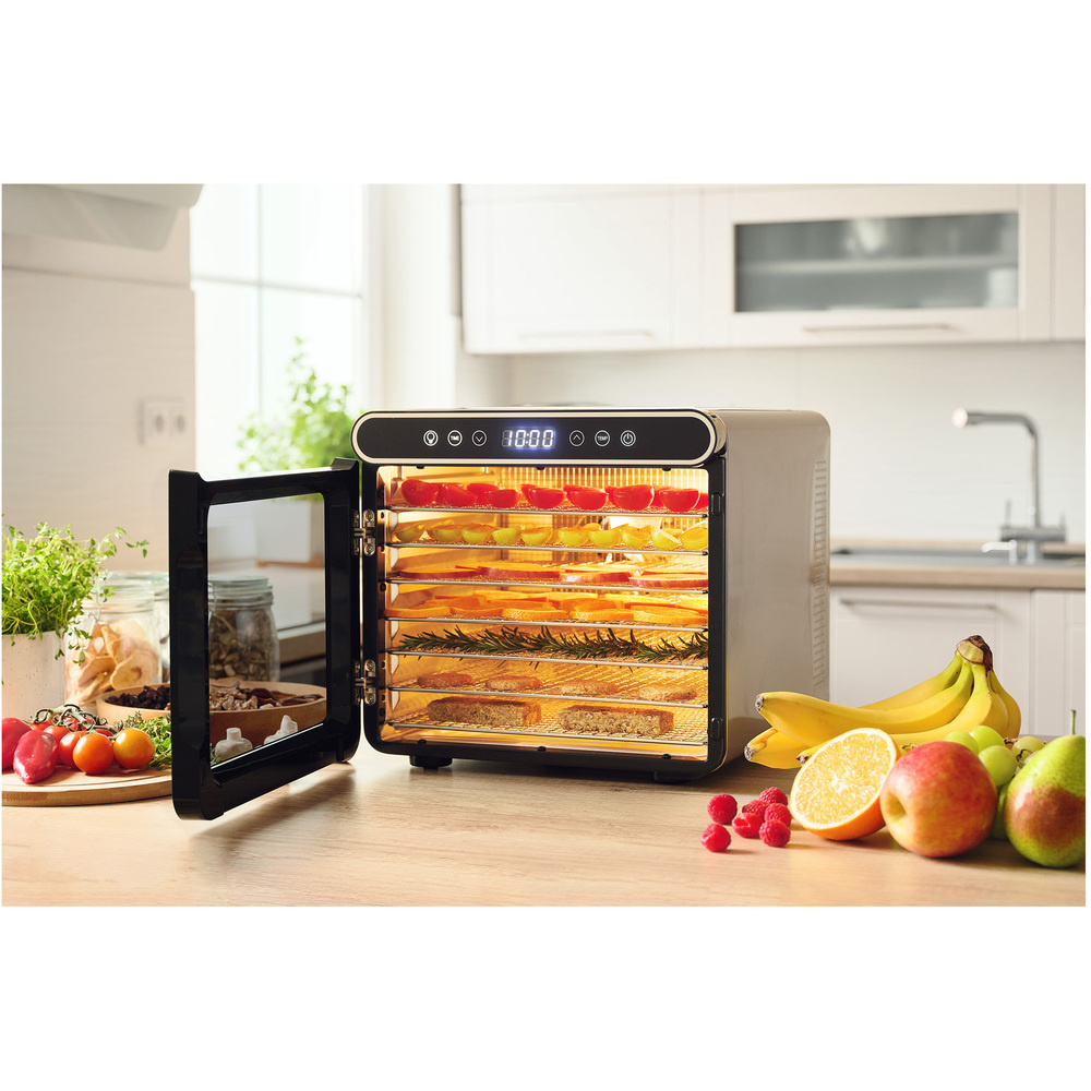 Vďaka piatim prednastaveným programom je sušenie naozaj jednoduché. Stlačením tlačidla môžete aktivovať optimalizovaný program na sušenie jabĺk, mäsa, húb, byliniek alebo cestovín. Každý program automaticky nastaví ideálnu teplotu a čas sušenia, zatiaľ čo LED indikátory prehľadne zobrazujú priebeh celého procesu.
