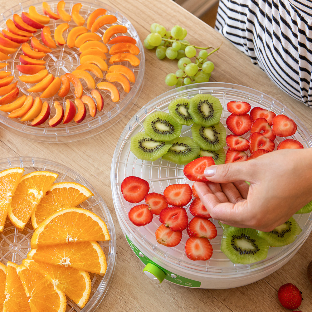 SENCOR SFD 790WH ponúka päť praktických dosiek s priemerom 23 cm a nastaviteľnou výškou 1,3 cm. Integrovaný ventilátor zabezpečuje optimálnu cirkuláciu horúceho vzduchu na všetkých podlažiach, zatiaľ čo špeciálna mriežková konštrukcia dosiek zabraňuje vzniku plesní a optimalizuje prúdenie vzduchu. Sušičku možno používať len z jedného plata, čo oceníte pri spracovaní menšieho množstva surovín.