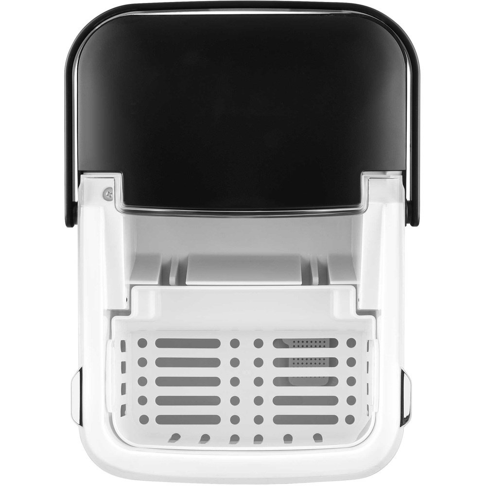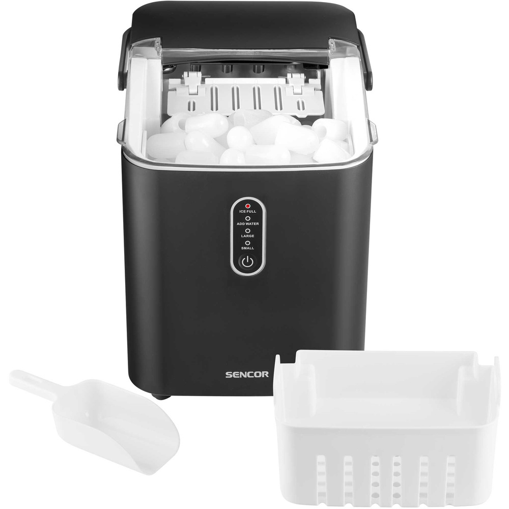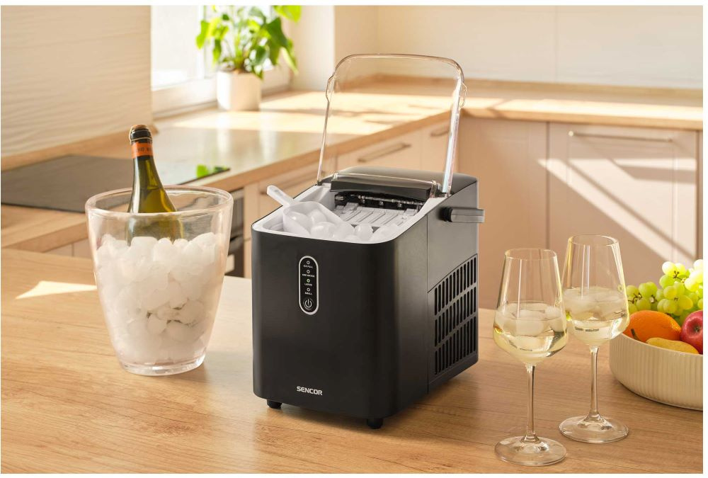 Výrobník ľadu SENCOR SIM 2500BK má praktické rozmery 268 × 217 × 282 mm, takže je vhodný aj do menších priestorov. S hmotnosťou iba 6,1 kg a ergonomickou rukoväťou je ľahko prenosný. Čierne plastové telo pôsobí moderne a hodí sa do každého interiéru, či už ide o mestskú kuchyňu, karavan alebo loď.