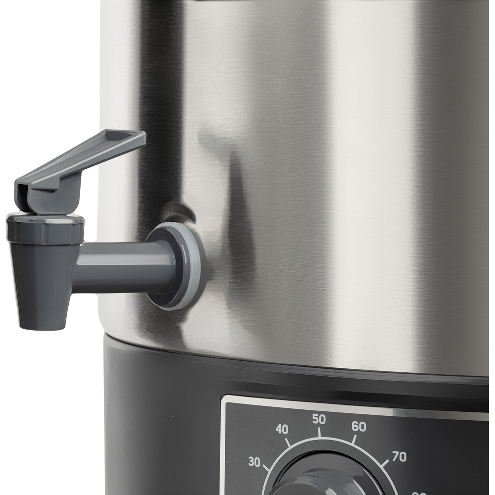 Hrniec ponúka dva praktické režimy prevádzky. Prvý umožňuje nastaviť teplotu na 30-100 °C a čas na 20-120 minút s automatickým odpočítavaním a zvukovým signálom. Druhý režim udržiava nastavenú teplotu nepretržite, čo je ideálne na udržiavanie teploty jedla pri servírovaní. Bezpečnosť zaisťuje dvojitá poistka s ochranou proti prehriatiu a poistkou proti zlyhaniu. Stabilná základňa, tepelne izolované rukoväte a prehľadný ovládací panel s intuitívnymi tlačidlami robia z tohto modelu spoľahlivého pomocníka do každej kuchyne.