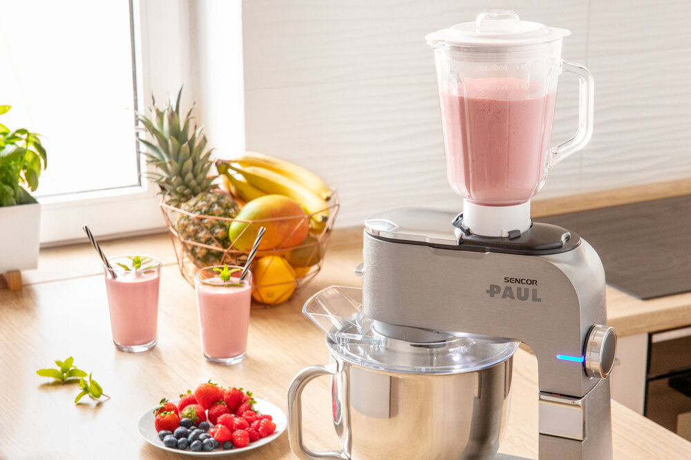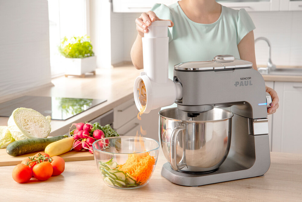 Multifunkčný kuchynský robot Sencor STM 7970 s výkonom 1 700 W bude vaším každodenným pomocníkom v kuchyni pri príprave akýchkoľvek potravín. Variabilná regulácia otáčok s pomalým štartom a šiestimi rýchlosťami, pulzná funkcia a robustné celokovové telo s kovovými prevodmi vám zaručia kvalitnú a dokonalú prevádzku. S bohatým príslušenstvom - vrátane strúhania, sekania a krájania, mlynčeka na kávu, výrobníka klobás a cukroviniek - si prídu na svoje milovníci mäsa a sladkostí. A ako čerešnička na torte je jeho vzhľad.