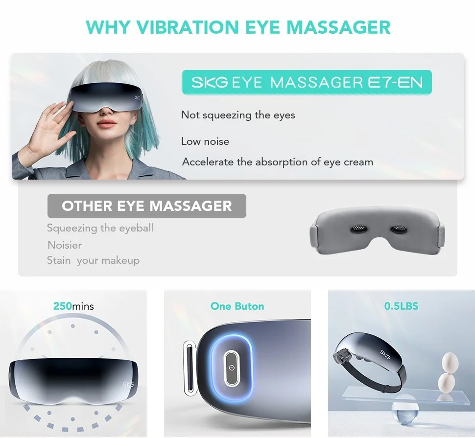 Doprajte si chvíle relaxácie a regenerácie s masážnym prístrojom SKG E7-EN. Masážny prístroj na oči a spánky SKG E7-EN predstavuje každodennú úľavu pre unavené oči a spánky. Ak sú vaše oči suché, pália a hlava vás neustále bolí po dlhých hodinách strávených pred obrazovkou počítača alebo televízora, masážny prístroj SKG E7-EN je dokonalým riešením. Masážny prístroj má 12 masážnych hlavíc so 4 prevádzkovými režimami: tlačenie, hnetenie, bitie a poklepávanie, ktoré napodobňujú profesionálnu ručnú masáž a nahrádzajú tradičné manuálne techniky. Tieto režimy sú starostlivo navrhnuté tak, aby poskytovali komplexnú starostlivosť o oblasť očí a spánkov, pričom každý režim sa zameriava na iné aspekty únavy a napätia.