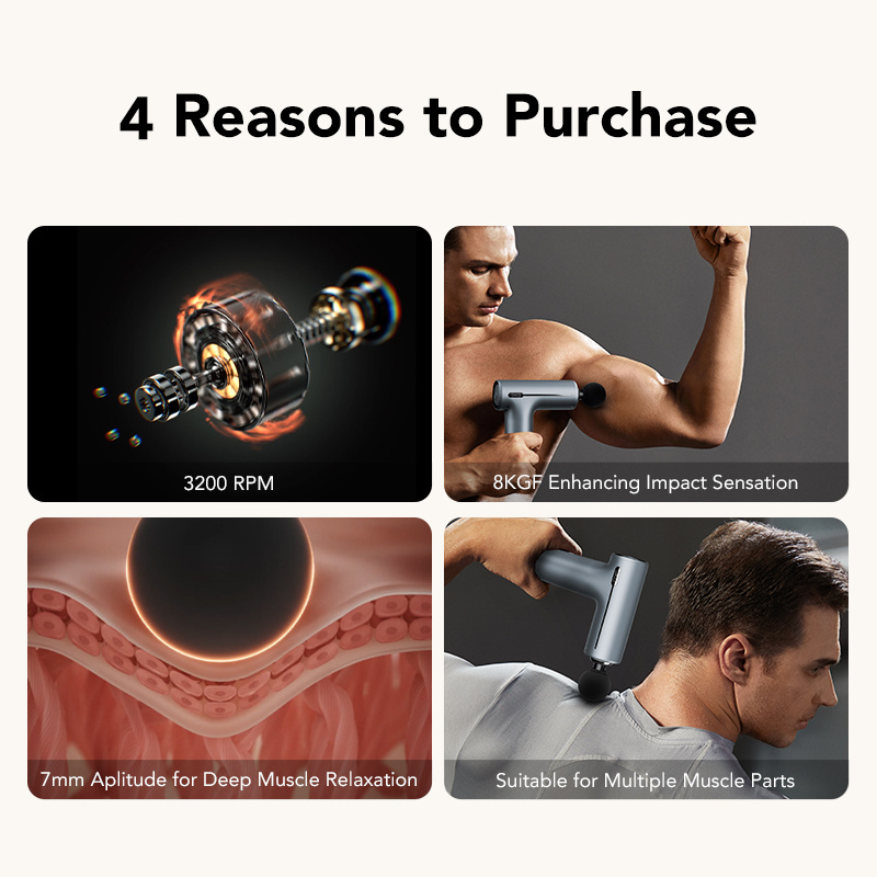 Masážna pištoľ SKG F1 PRO je ideálnym nástrojom pre športovcov a všetkých, ktorí trpia svalovou stuhnutosťou. Vďaka výkonnému motoru s rýchlosťou až 3200 otáčok za minútu a sile úderu 8 kg poskytuje silnú perkusnú terapiu , ktorá pomáha uvoľniť svaly, zlepšiť krvný obeh a urýchliť regeneráciu po fyzickej aktivite. Hĺbka úderu 7 milimetrov umožňuje dosiahnuť hlboké vrstvy svalov a účinne podporuje regeneráciu svalov. Zariadenie ponúka 6 nastaviteľných úrovní rýchlosti - nižšie nastavenia (úroveň 1) ideálne na jemnú relaxáciu v práci, stredné úrovne (2-3) na upokojenie doma pred televízorom, úroveň 4 na hĺbkovú regeneráciu, ktorá pomáha zmierniť bolesti svalov po tréningu, a intenzívne úrovne (5-6) na intenzívnu relaxáciu, ktorá vám pomôže zaspať po dlhom a stresujúcom dni. Výkonná perkusná technológia preniká hlboko do svalového tkaniva a účinne uvoľňuje stuhnutosť, napätie a napätie.