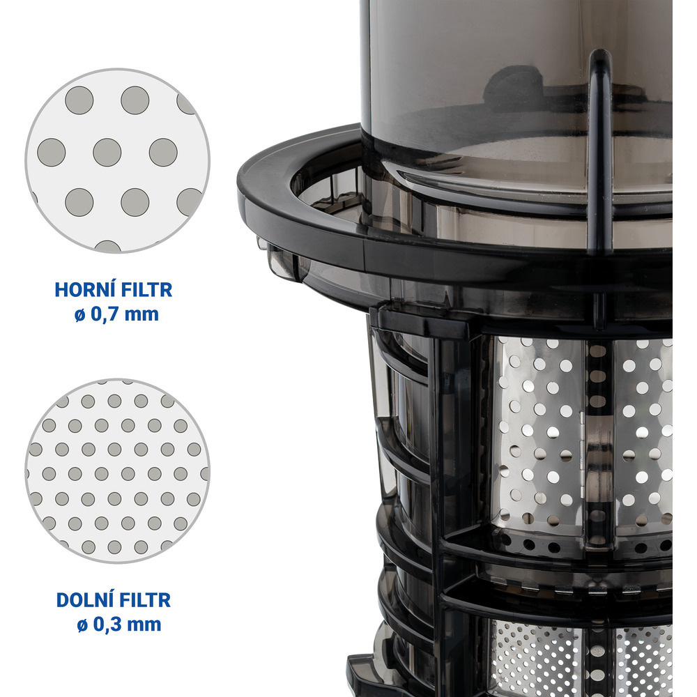 Stroj je vybavený spoľahlivým 200 W motorom a robustnou lisovacou skrutkou z vysoko odolného plastu, ktorá si ľahko poradí aj s tvrdšími surovinami. Jemný dvojvrstvový mikrofilter zabezpečuje dôkladné oddelenie dužiny a vytvára hladkú, jemnú šťavu s plnou a prirodzenou chuťou, vhodnú na každodennú konzumáciu.